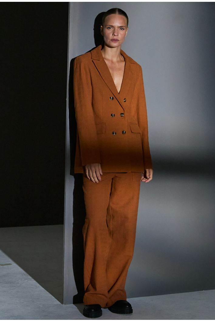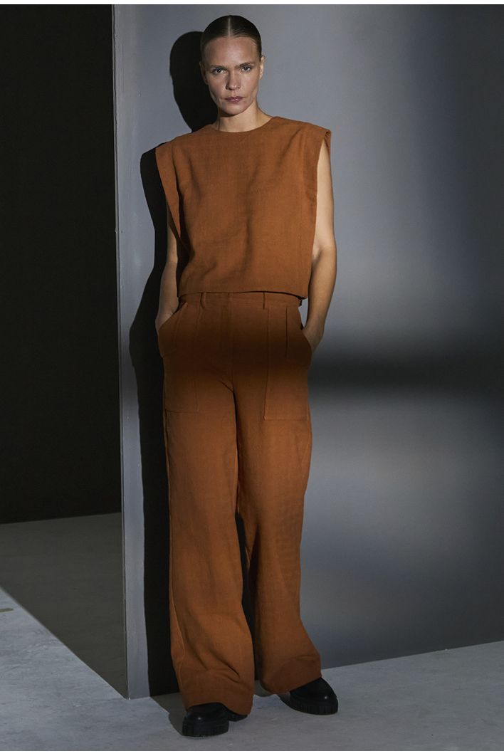 A Calça Belyi é confeccionada em tecido de tweed, oferecendo uma superfície texturizada que adiciona sofisticação e estilo ao visual. Com bolsos frontais e traseiros, essa calça alia praticidade e conforto, sendo ideal para a mulher moderna que busca peças funcionais sem abrir mão da elegância.