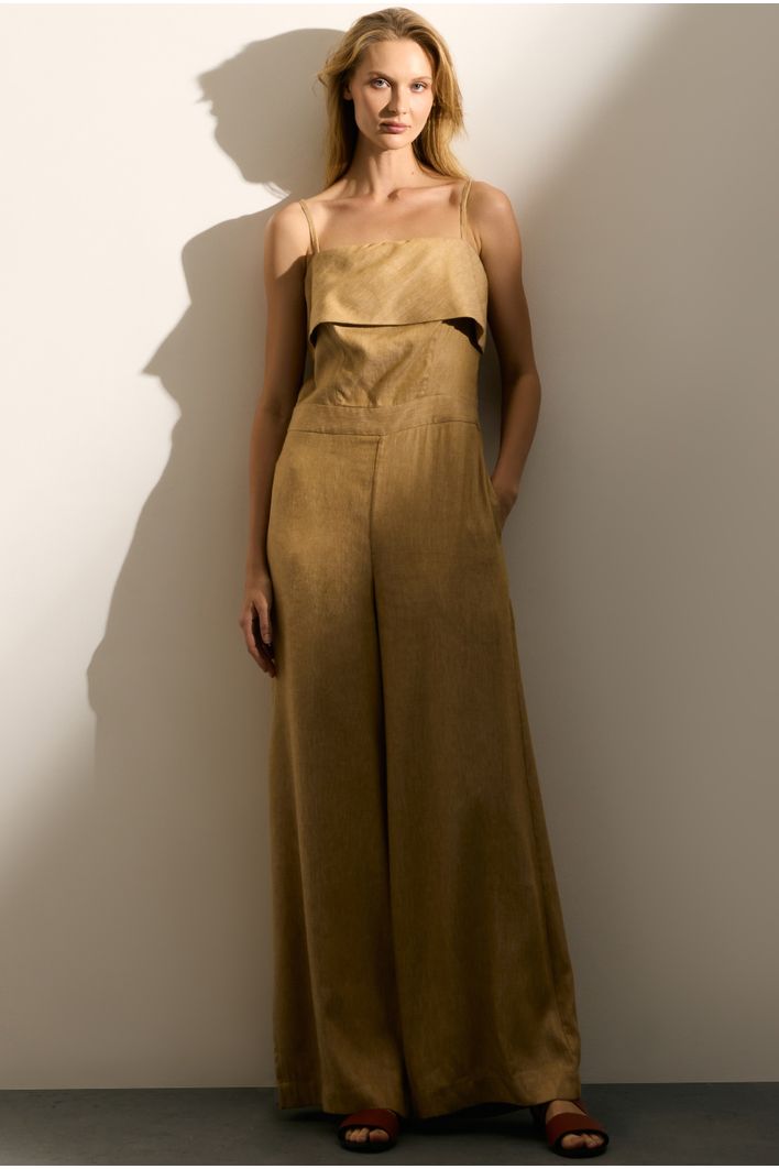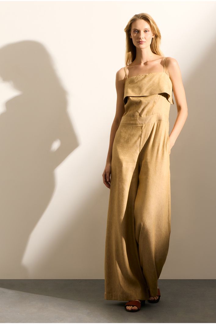 Com uma modelagem pantalona que valoriza o movimento e o caimento fluido, a peça é complementada por um zíper invisível na lateral para um acabamento impecável. Os bolsos laterais são um toque funcional e prático, enquanto a pala delicada na altura do busto adiciona charme e exclusividade.