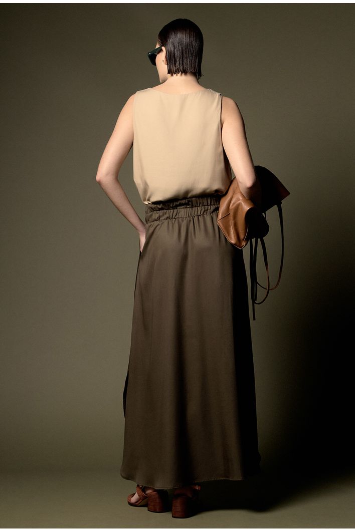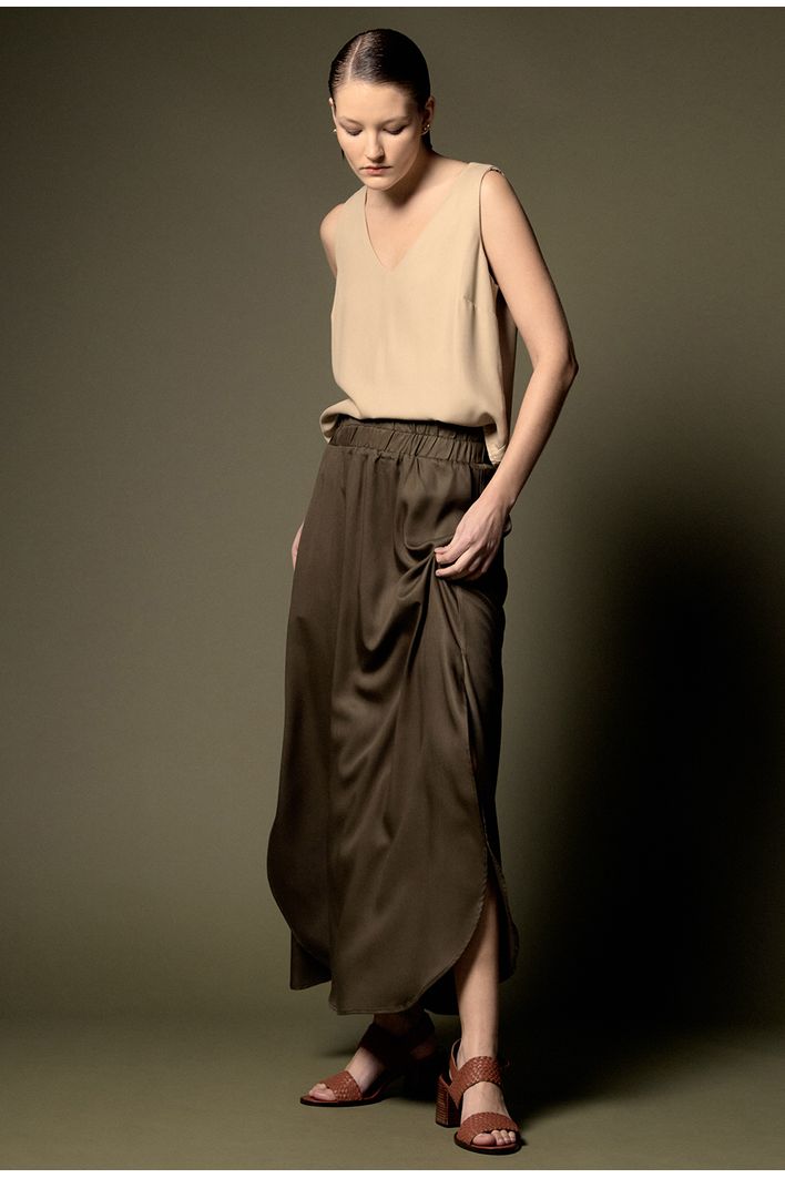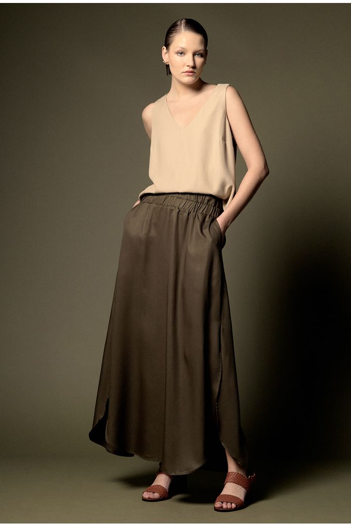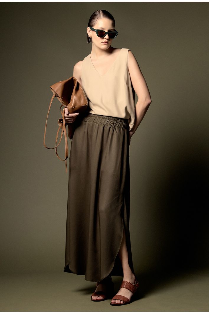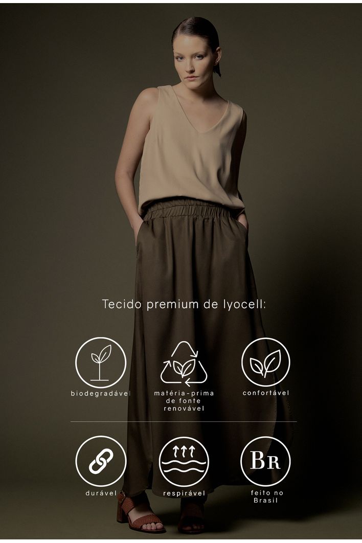 A Saia Chelba é confeccionada em 100% lyocell, uma fibra sustentável derivada da celulose. O lyocell é conhecido por seu toque macio, respirabilidade e baixo impacto ambiental. Com comprimento longuete, essa saia valoriza a silhueta, alongando as pernas de maneira elegante e sofisticada. O cós com elástico proporciona uma adaptação perfeita ao corpo, garantindo conforto e praticidade. As duas fendas laterais permitem liberdade de movimento e acrescentam um charme único à peça, tornando-a versátil e cheia de bossa.