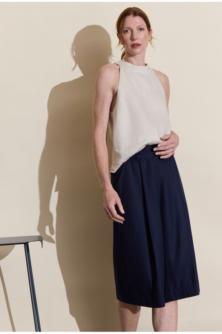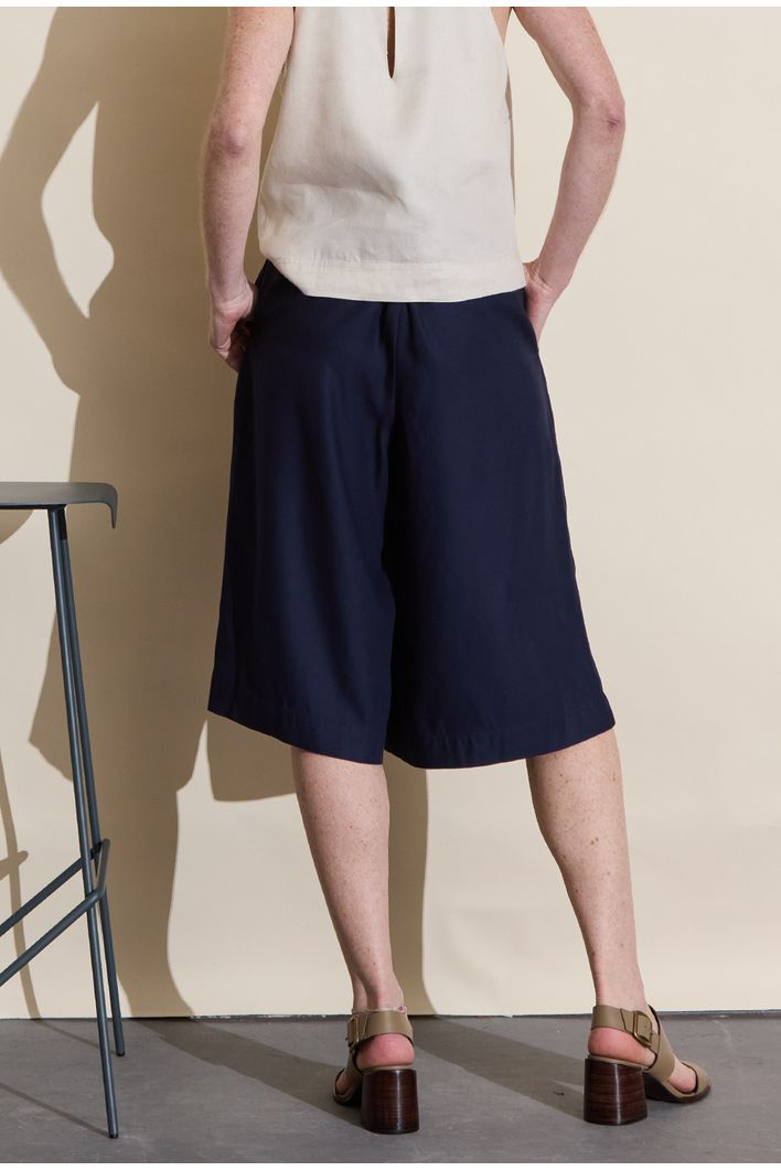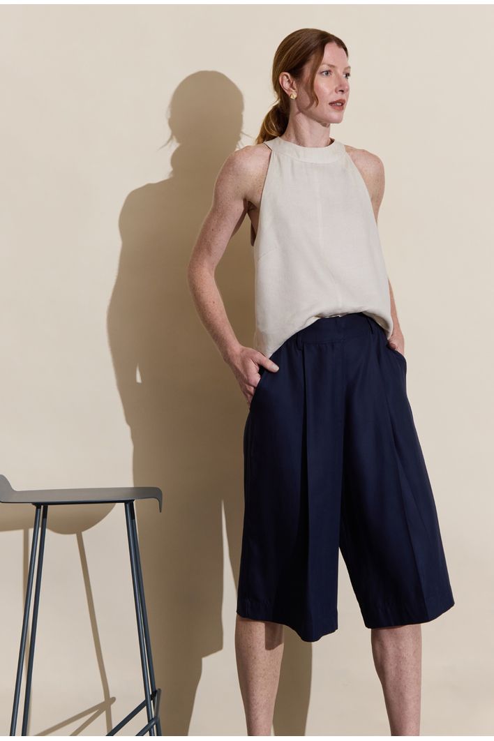Com toque suave e fluidez natural, esta bermuda é confeccionada em 100% viscose ecovero — uma fibra sustentável derivada de fontes renováveis e produzida com baixo impacto ambiental. Sua modelagem ampla garante conforto e movimento, enquanto o cós estruturado e as pregas frontais conferem um ar sofisticado e moderno.O design elegante permite combinações versáteis, transitando com facilidade entre produções casuais e mais refinadas. Leve e respirável, é uma escolha perfeita para quem valoriza estilo aliado à sustentabilidade.