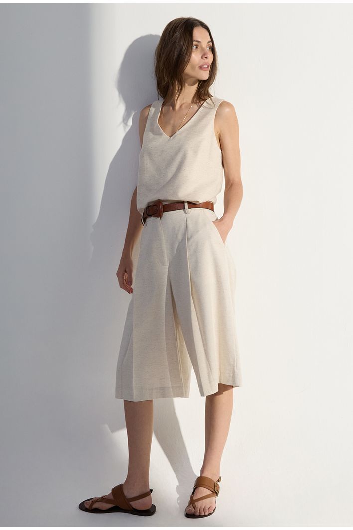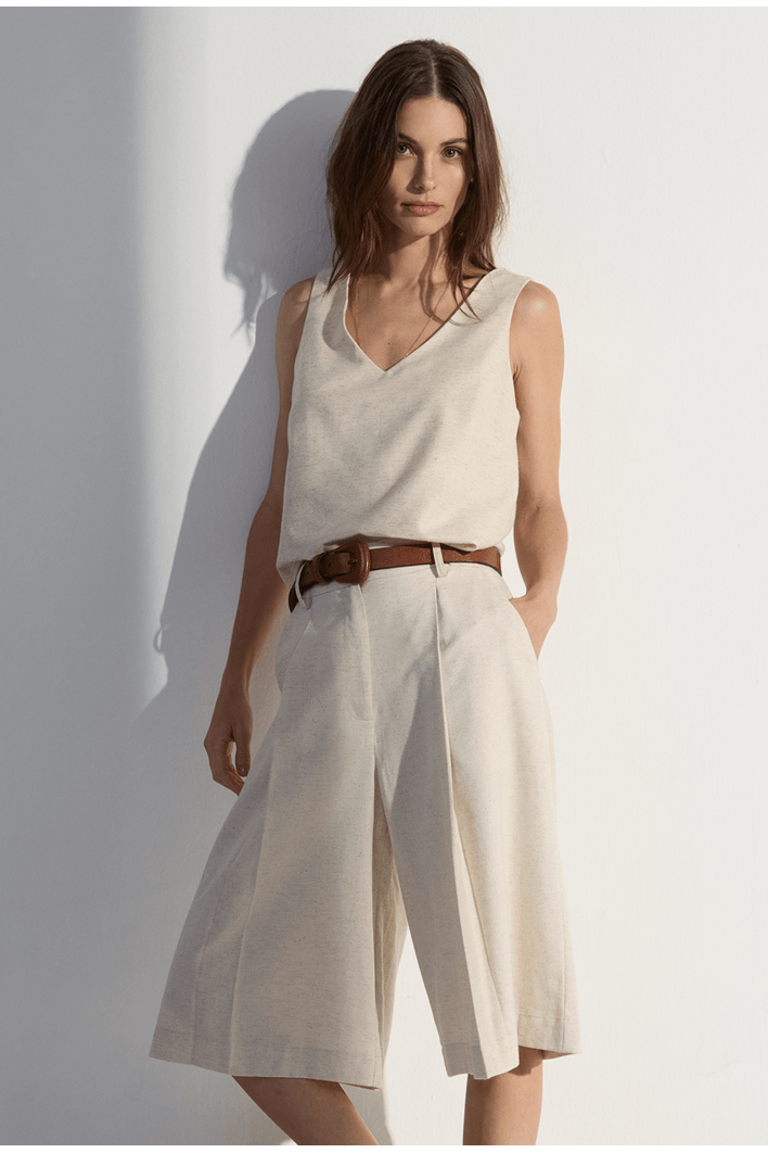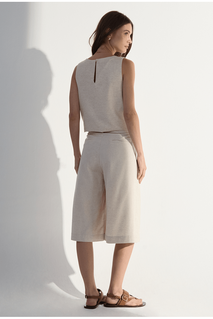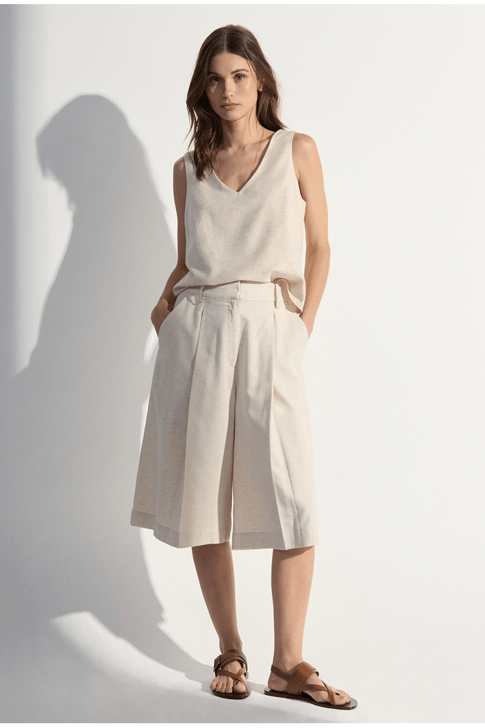 Elegante e naturalmente sofisticada, esta bermuda foi desenvolvida em um blend nobre de algodão, seda e linho — uma combinação que garante toque macio, leveza e respirabilidade em um único design. Seu caimento fluido realça o movimento sem perder estrutura, enquanto as pregas frontais adicionam um toque refinado e contemporâneo à peça. O comprimento midi oferece modernidade e versatilidade, perfeito para composições casuais ou arrumadas. Uma escolha ideal para quem busca conforto premium com estética minimalista e elegante.