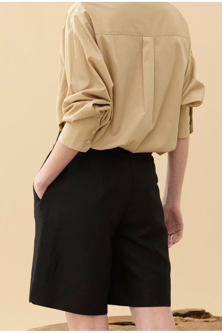 Com modelagem de alfaiataria, possui vincos frontais elegantes, comprimento acima do joelho e detalhes funcionais como bolsos laterais e passantes para cintos e faixas. O acabamento fica por conta do botão central delicado e sofisticado, que complementa com charme essa peça versátil.