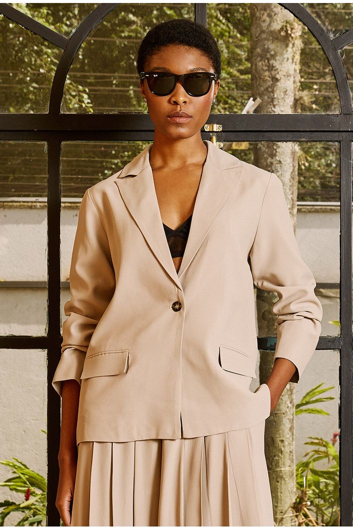 Confeccionado com o renomado crepe patou, este blazer oferece elegância e sustentabilidade. Seu tecido, conhecido pelo peso impecável, qualidade visual e certificações ambientais, possui um toque levemente creponado por fora, trazendo sofisticação, e um toque acetinado no interior, proporcionando extremo conforto. A fibra de origem celulósica do tecido é certificada, natural e biodegradável, reforçando nosso compromisso com o meio ambiente. Com dois bolsos frontais funcionais e um botão centralizado que confere sofisticação, o Blazer Carimata é a peça ideal para composições sofisticadas, combinando perfeitamente com outras peças de crepe patou disponíveis em nossa loja.