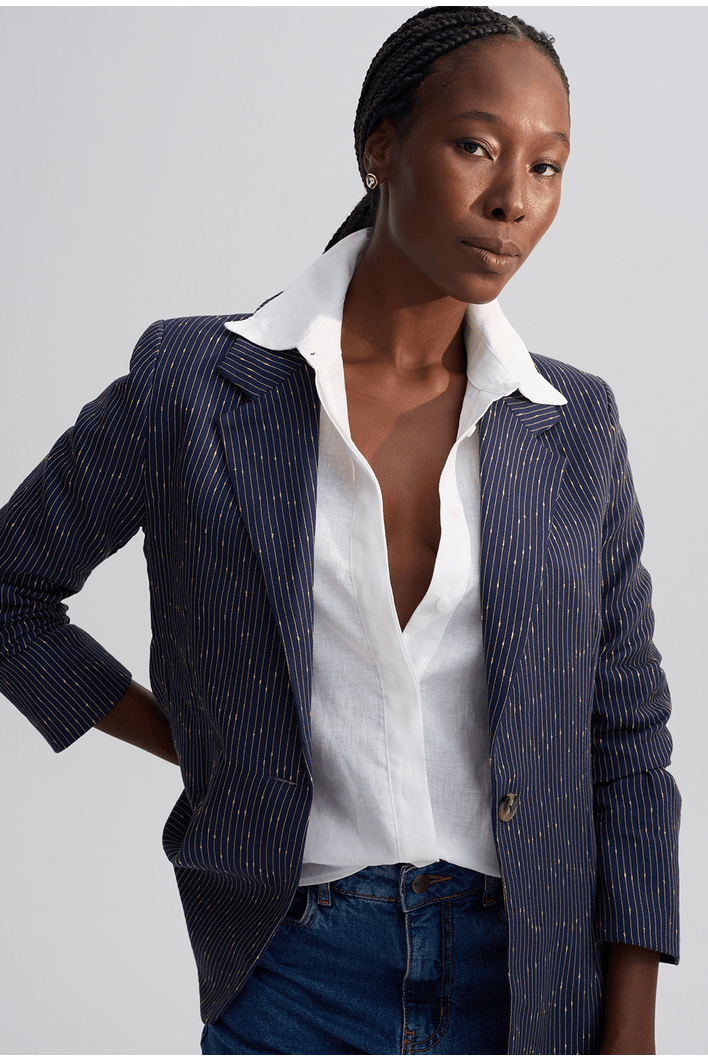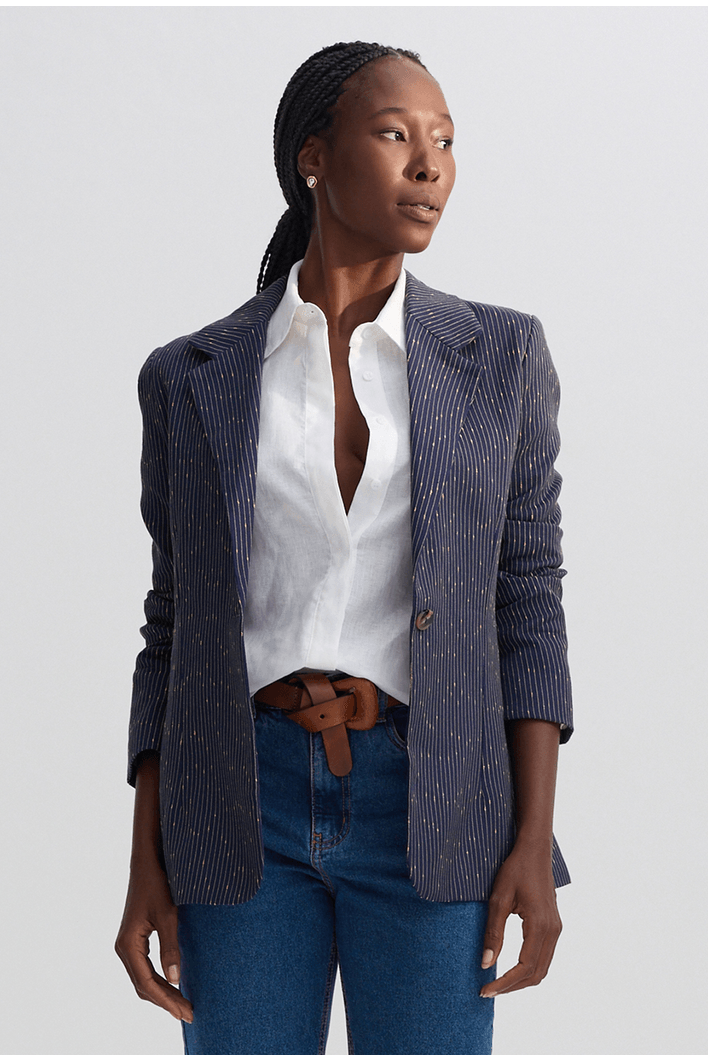 Blazer feminino de alfaiataria com padronagem risca de giz, desenvolvido para trazer sofisticação e versatilidade ao guarda-roupa. Possui modelagem levemente estruturada, que valoriza a silhueta sem comprometer o conforto, além de acabamento refinado que garante um visual elegante e atemporal.