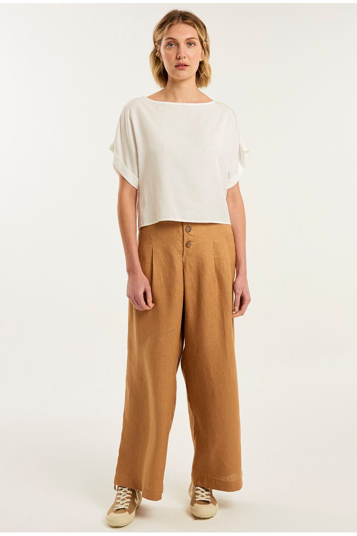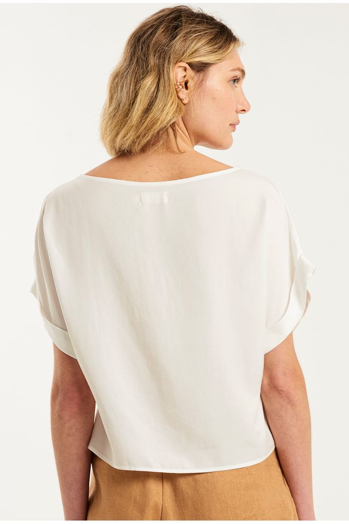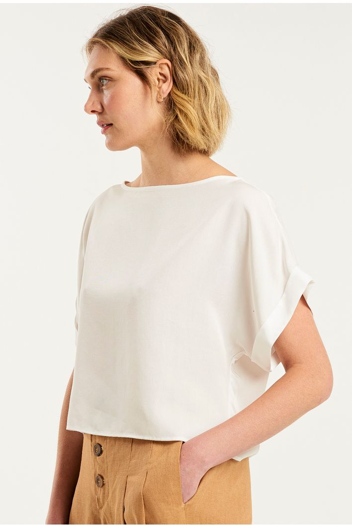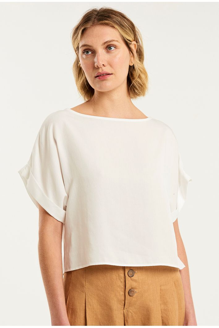 modelagem ampla e reta, gola canoa e manga com dobrinha, detalhe que traz ainda mais charme para esta peça. É uma peça clássica com um toque de modernidade e é perfeita para quem gosta de se vestir com conforto sem perder a elegância.