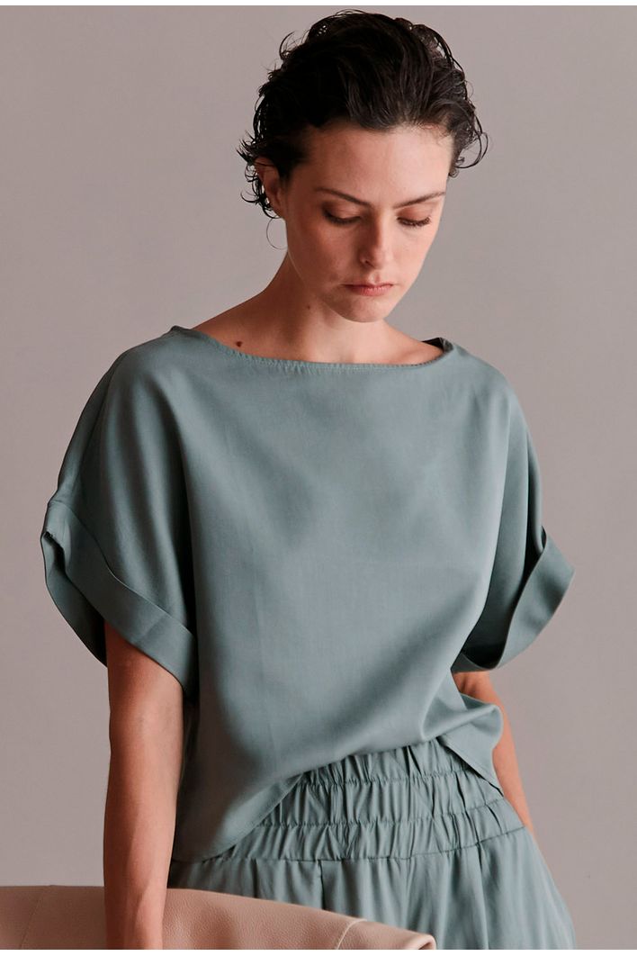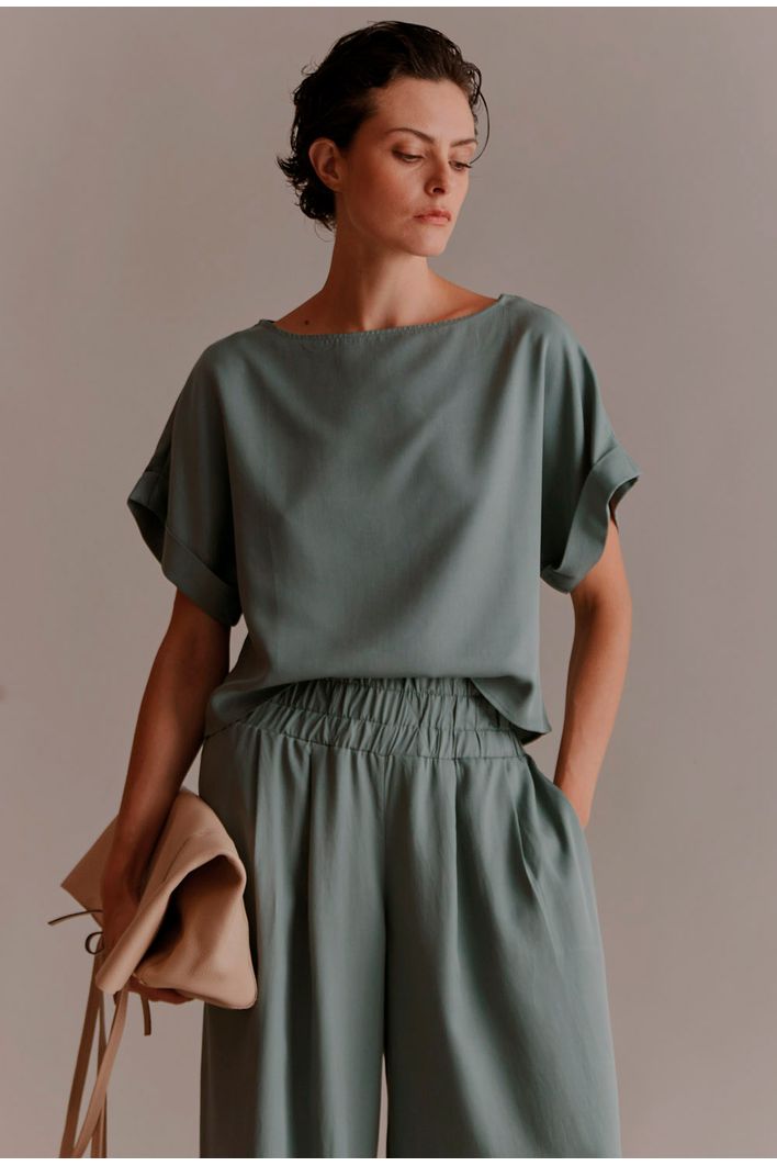 Modelagem ampla e reta, gola canoa e manga com dobrinha, detalhe que traz ainda mais charme para esta peça. É uma peça clássica com um toque de modernidade e é perfeita para quem gosta de se vestir com conforto sem perder a elegância.