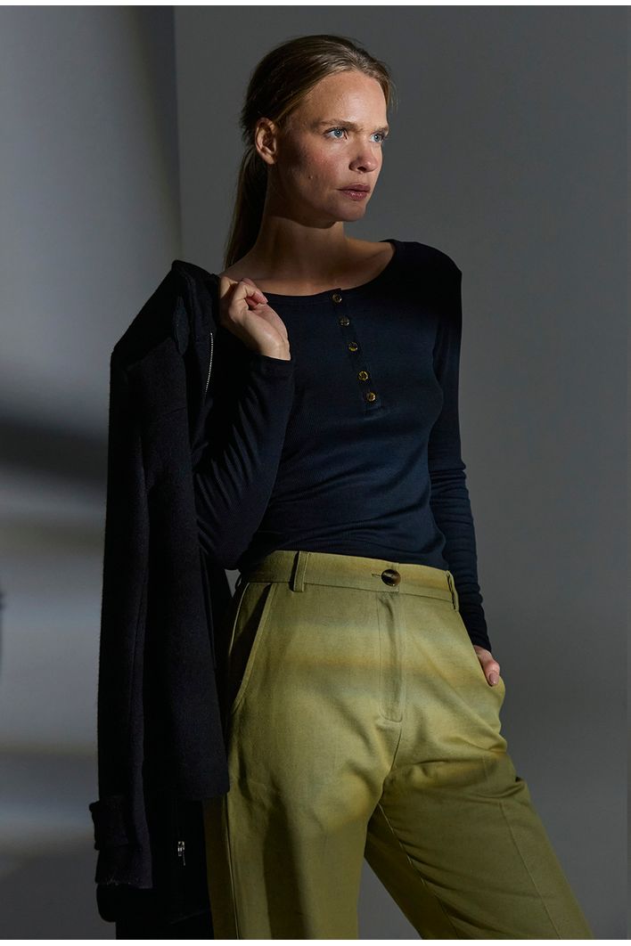 A Blusa Bjorko é uma peça confeccionada em malha canelada de viscose, proporcionando um extremo conforto ao vestir. A malha canelada é conhecida por sua elasticidade e por se ajustar ao corpo de forma suave, garantindo uma sensação agradável ao toque.