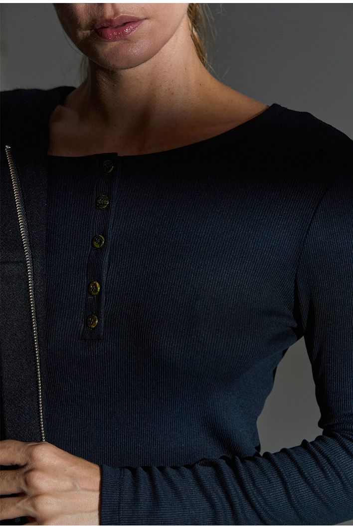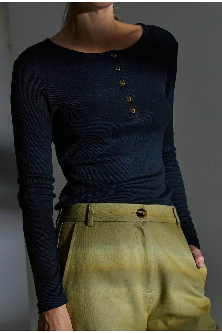 Esta blusa é um modelo básico, porém com um toque único dado pelos pequenos botões. Esses botões adicionam um detalhe charmoso ao design da peça, tornando-a mais interessante e estilosa. Eles também oferecem a possibilidade de ajustar o decote conforme desejado, proporcionando versatilidade ao uso.