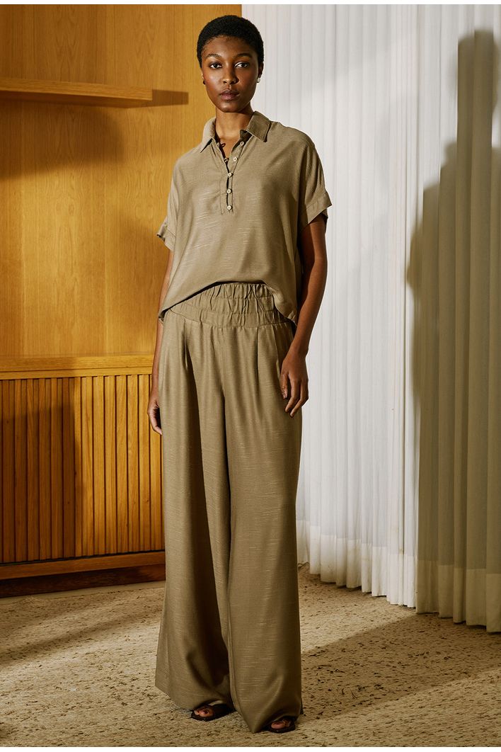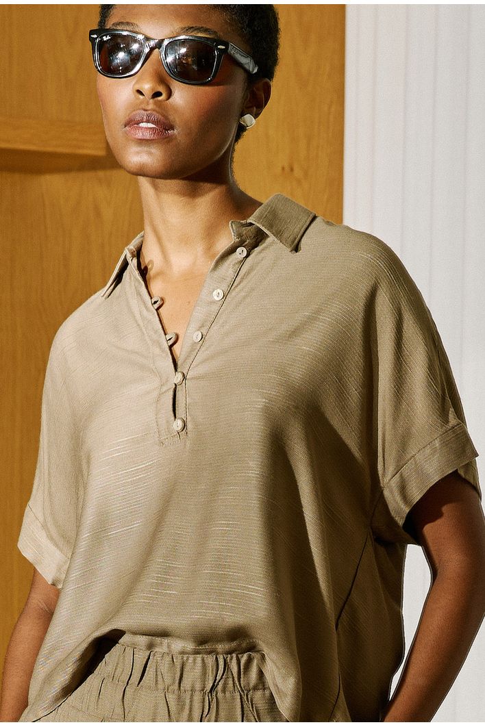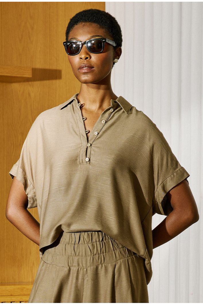 Camisa Conception de estilo minimalista e sofisticado, confeccionada em tecido leve de caimento fluido. Possui gola clássica, fechamento parcial por botões frontais e mangas curtas dobradas, que trazem um toque moderno e despojado. a modelagem soltinha garante conforto e versatilidade, perfeita para composições elegantes e casuais.