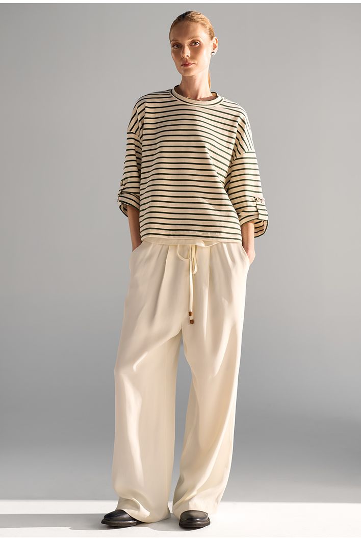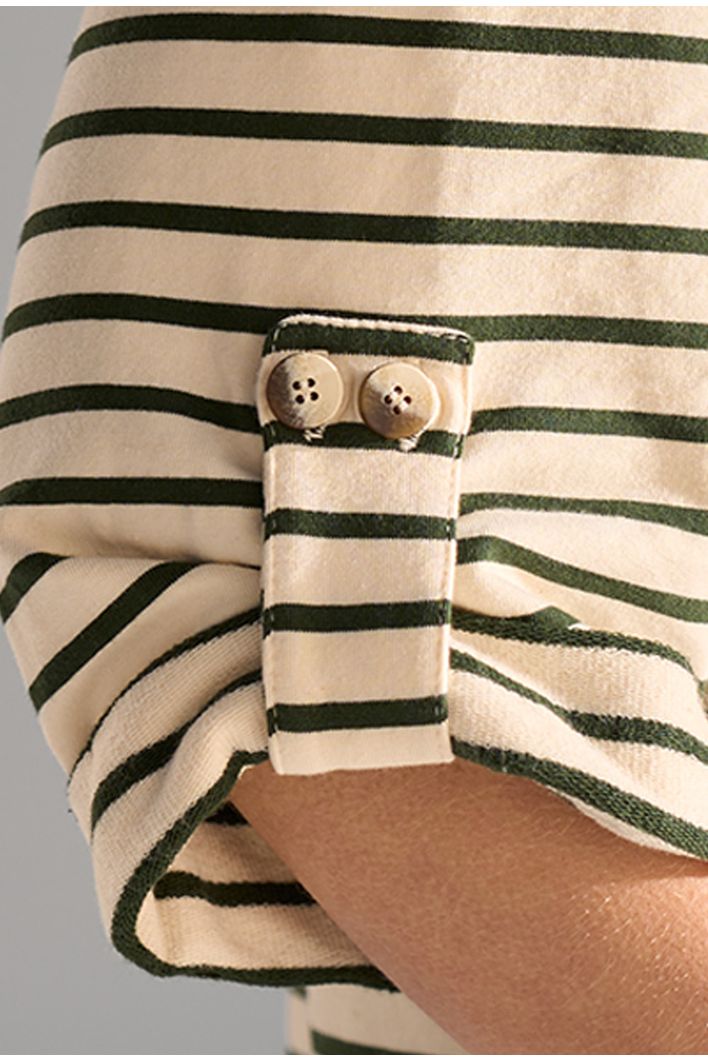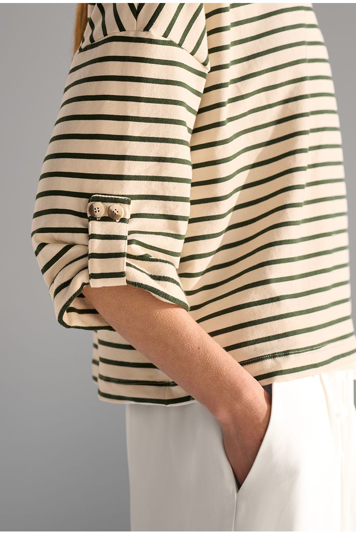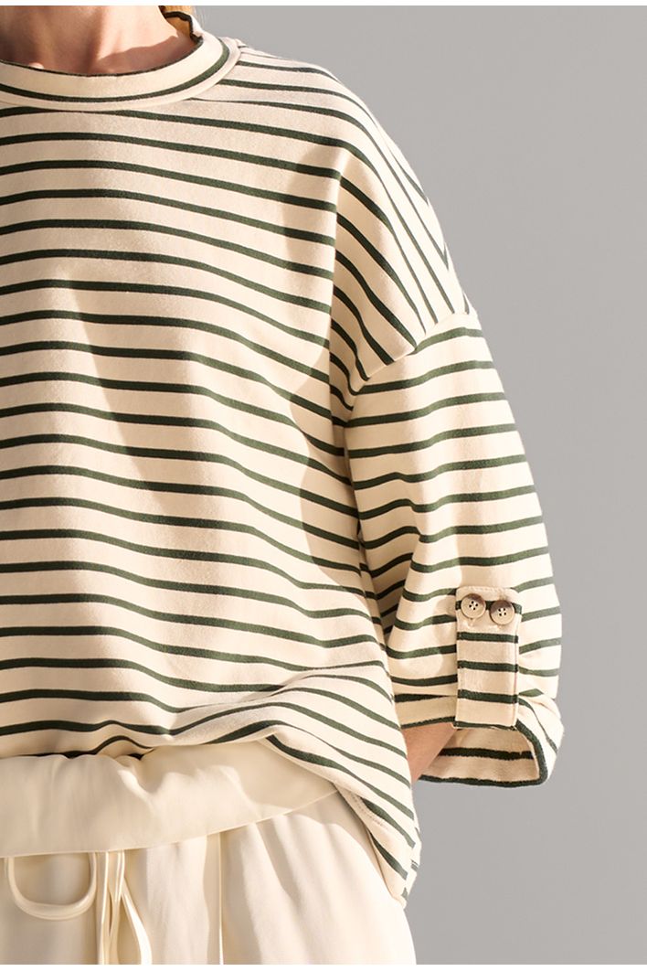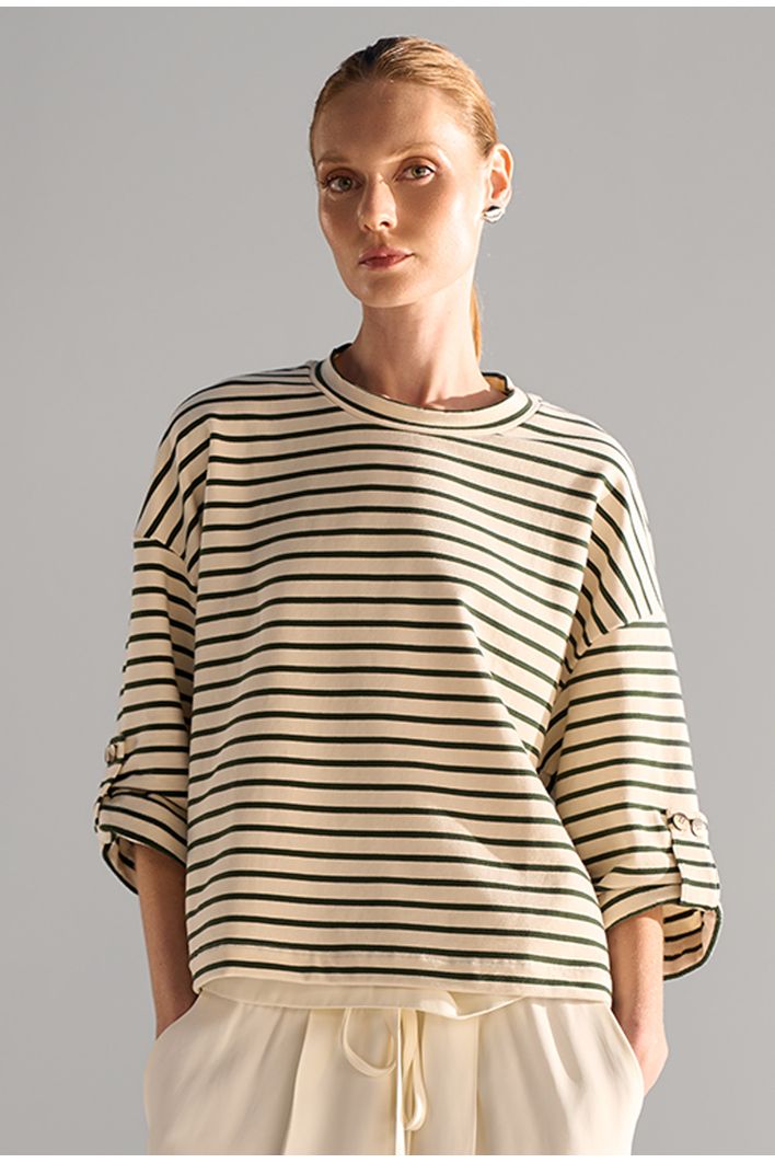 A Blusa Croacia é uma peça elegante com estrutura impecável e mangas amplas que trazem um toque de sofisticação e fluidez ao visual. O detalhe dos botões nas mangas adiciona um charme delicado e exclusivo, tornando a peça ainda mais interessante. As listras horizontais, além das clássicas, ao longo da silhueta e buscando uma sensação de equilíbrio visual, ideal para looks que valorizam a harmonia do corpo. Feita em algodão, a blusa oferece respirabilidade, maleabilidade e extremo conforto, garantindo frescor e conforto ao toque, perfeita para o dia a dia