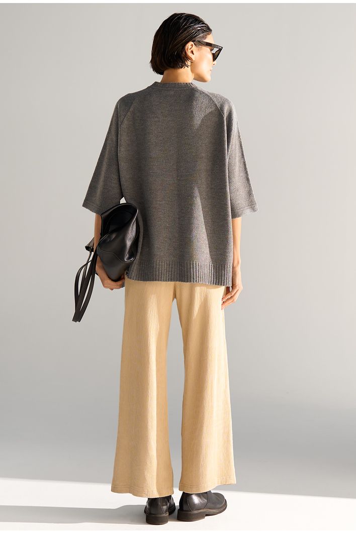 A Blusa em Tricot Oversized é a união perfeita entre estilo minimalista e conforto absoluto. Com modelagem ampla e caimento solto, ela traz uma estética moderna e descomplicada para os dias mais frescos. Sua gola levemente alta e as mangas amplas em comprimento 3/4 garantem sofisticação e liberdade de movimento.