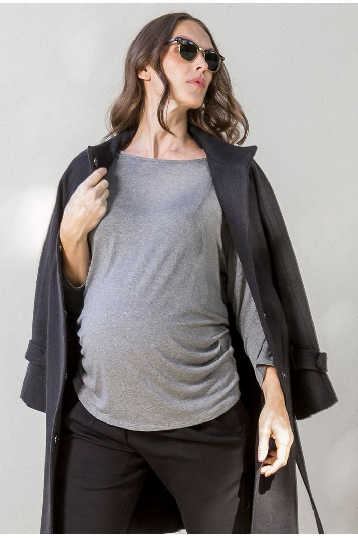Produzida em viscose premium, a blusa Trento possui shape solto, decote redondo e manga 7/8. Ideal para gestante, a peça conta com pregas laterais, na altura da barriga, para maior conforto.