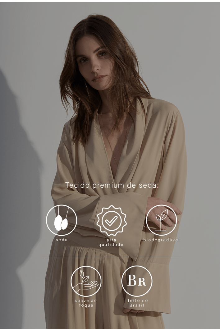 A Blusa Glasgow de seda traduz sofisticação em sua forma mais natural. Com toque ultramacio e caimento leve, o tecido realça o movimento fluido da peça, criando um visual elegante e contemporâneo.