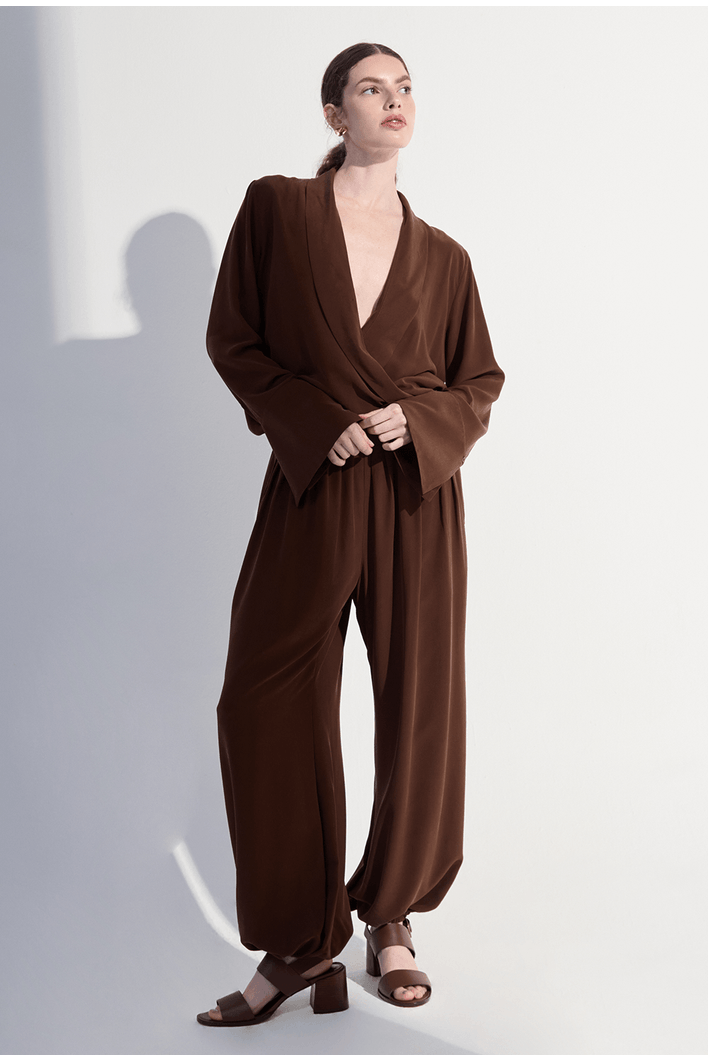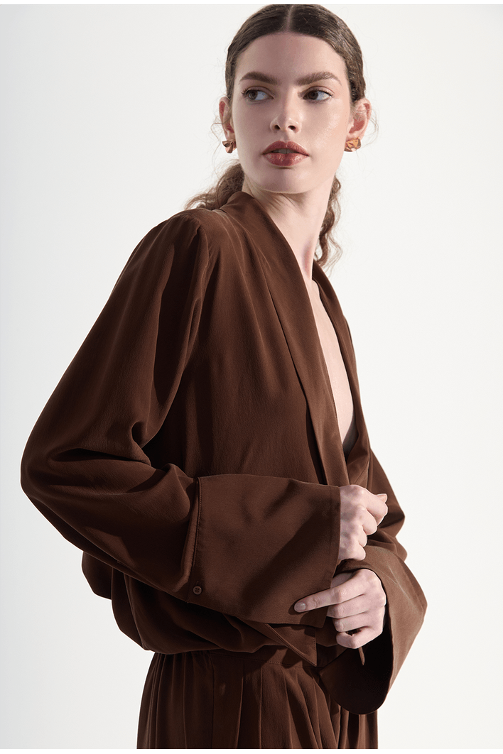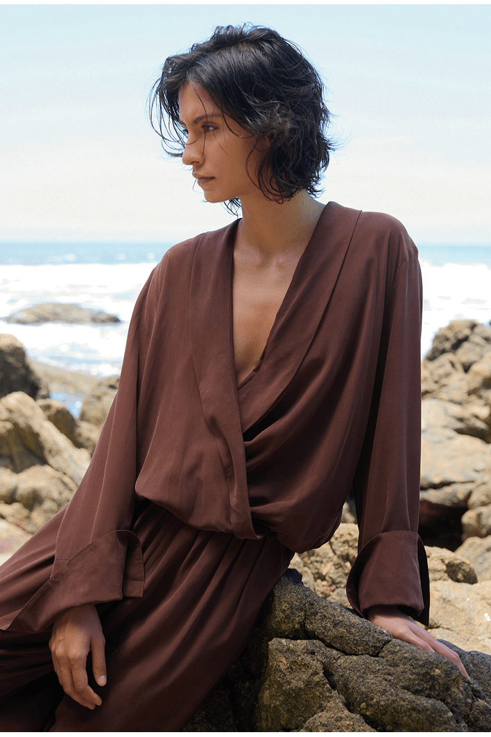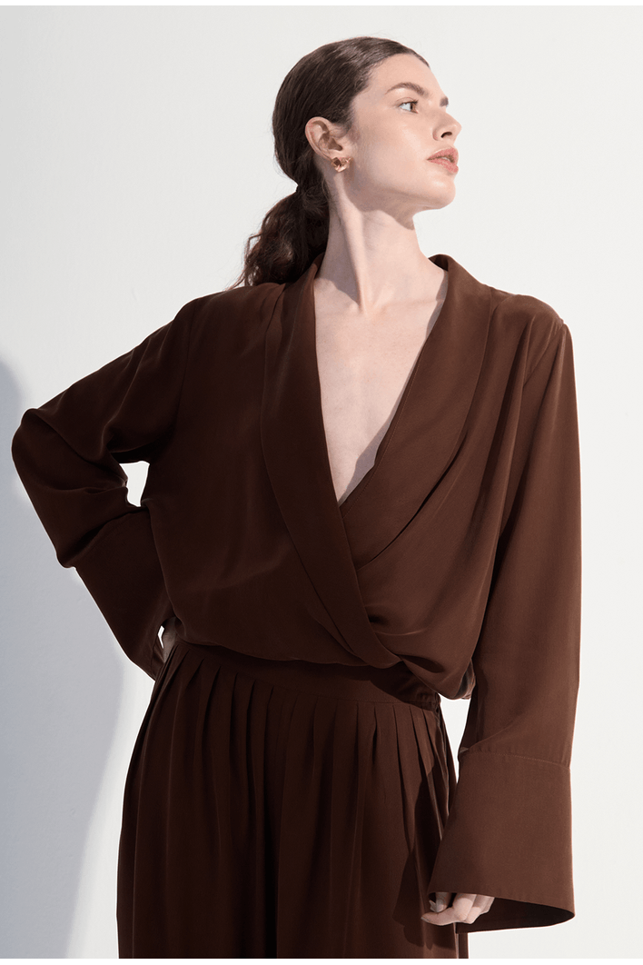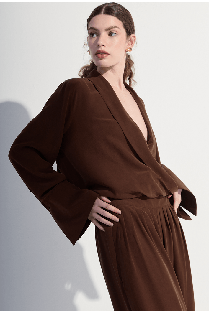 O decote transpassado adiciona profundidade e delicadeza, enquanto as mangas longas com volume sutil reforçam o charme refinado da modelagem. A cintura marcada suavemente garante proporção equilibrada e um acabamento impecável.