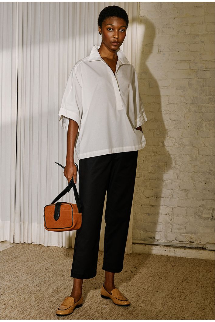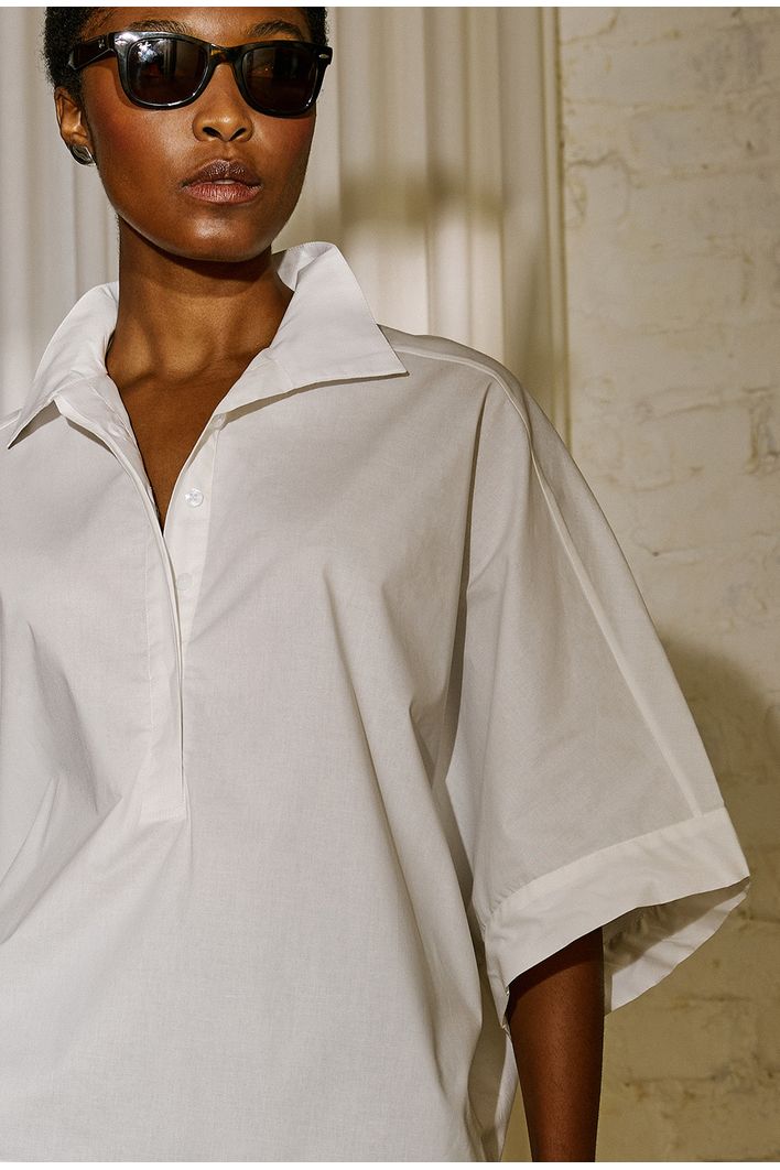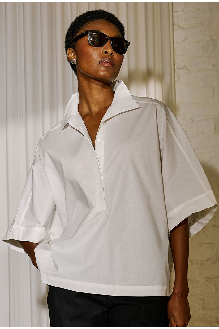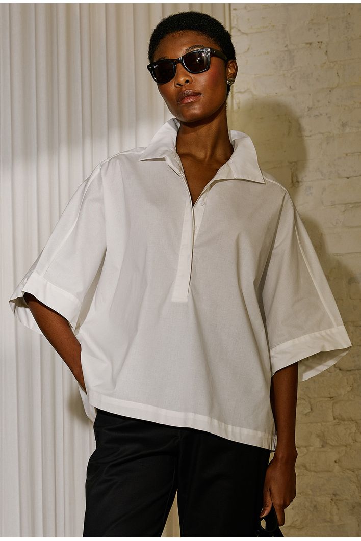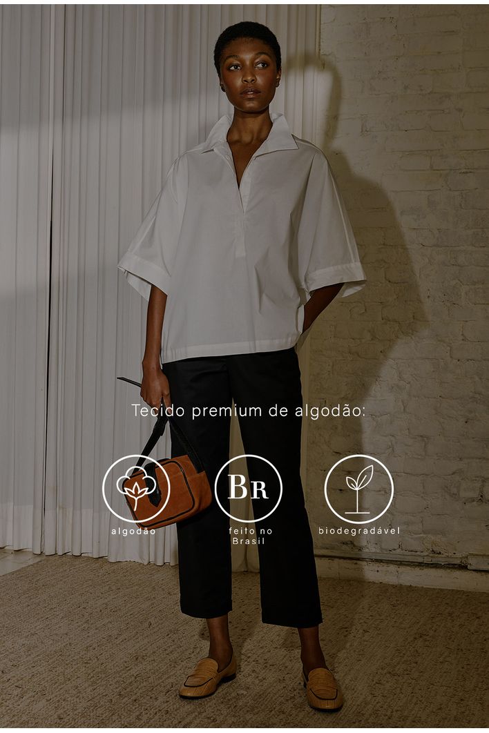 Blusa greely, ampla em modelagem oversized, com gola clássica e fechamento frontal oculto que garante acabamento minimalista. Versátil e sofisticada, é perfeita para composições modernas que unem conforto e estilo atemporal.
