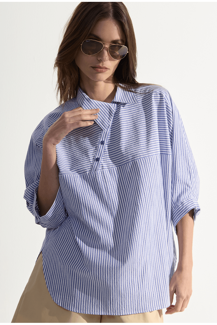 Blusa Hoste Oversized Com Detalhe Diagonal Listra Azul
