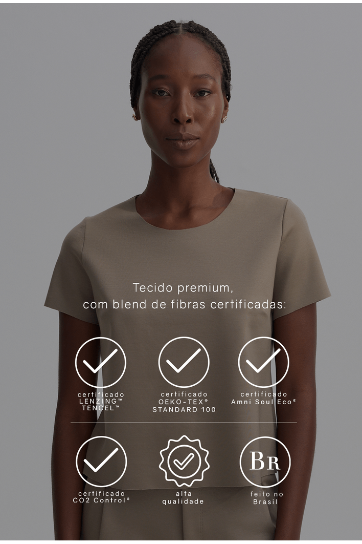 Modelo veste P.Saiba mais sobre o lyocell: aqui na MyBasic temos como principal objetivo fazer parte de uma cadeia produtiva saudável, permeando questões socioambientais em prol de um mundo melhor. É muito importante pensar em durabilidade quando falamos de peças sustentáveis, visto que, quanto mais duráveis, menos peças serão descartadas ao longo do tempo. Só no Brasil, são descartadas cerca de 4 milhões de toneladas de resíduos têxteis entre roupas e retalhos que não voltarão a ser usados.