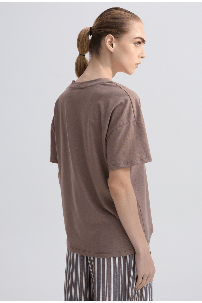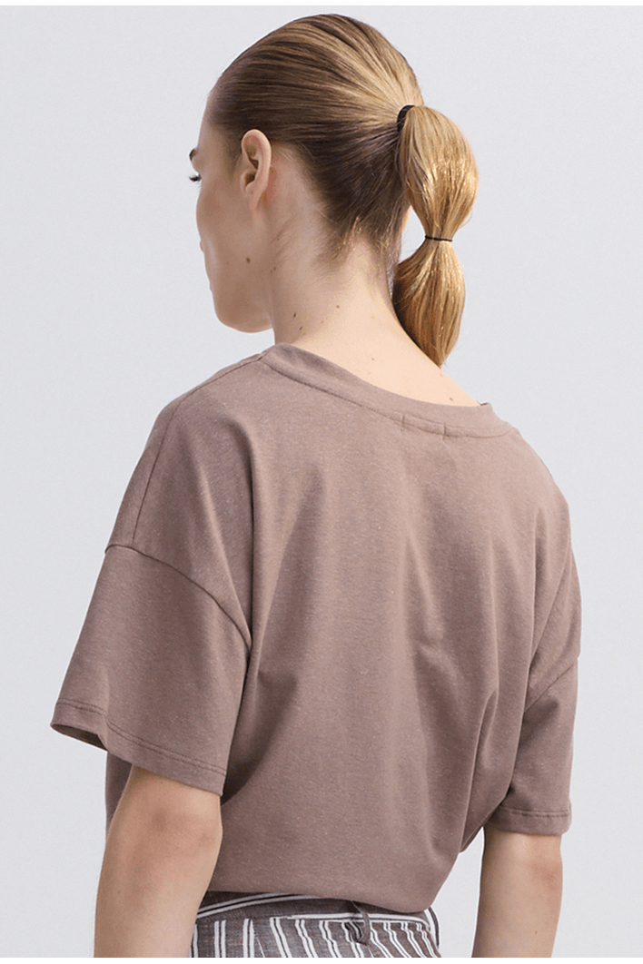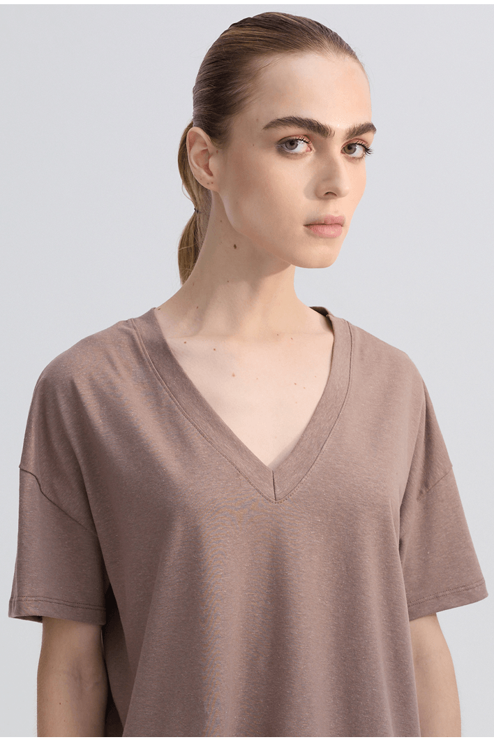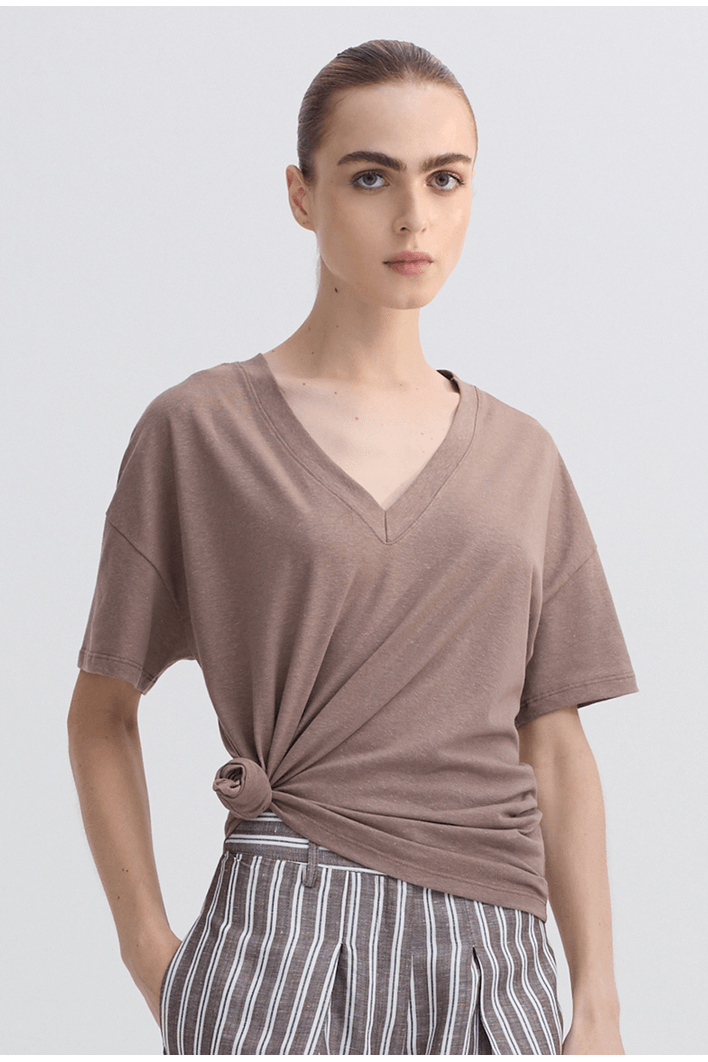 Blusa de modelagem moderna e confortável, confeccionada em malha de toque macio e caimento leve. O decote em V valoriza o colo de forma elegante, enquanto as mangas curtas e levemente amplas garantem liberdade de movimento e um visual contemporâneo.