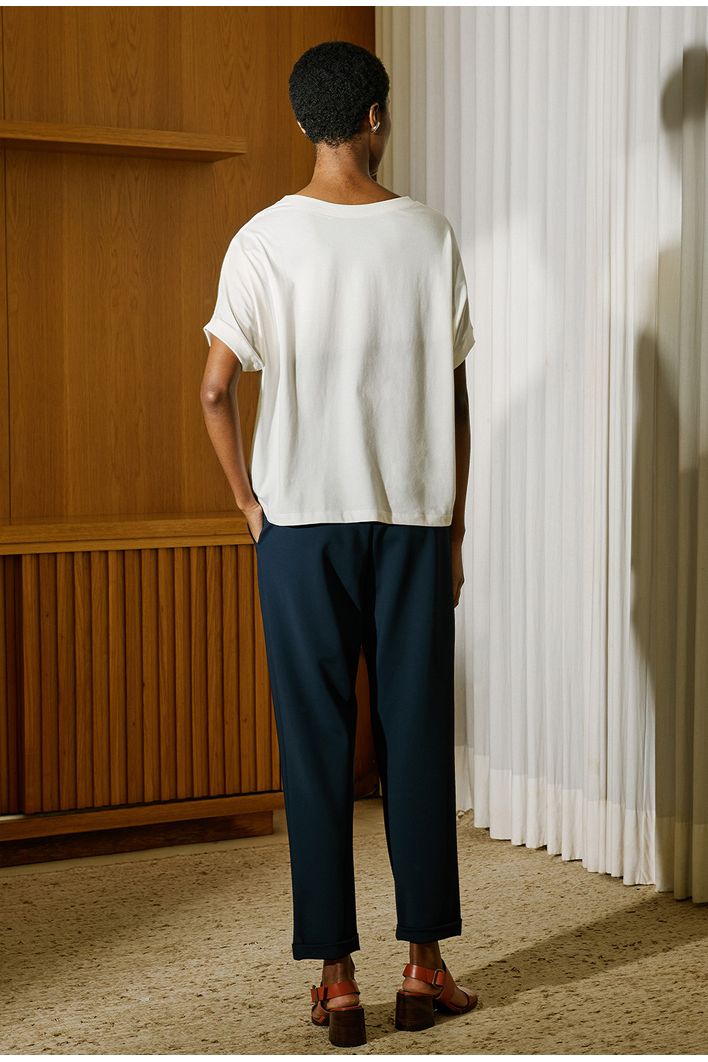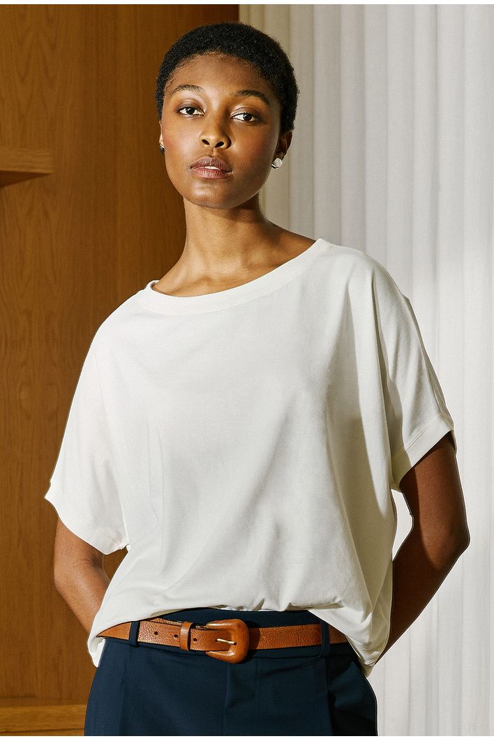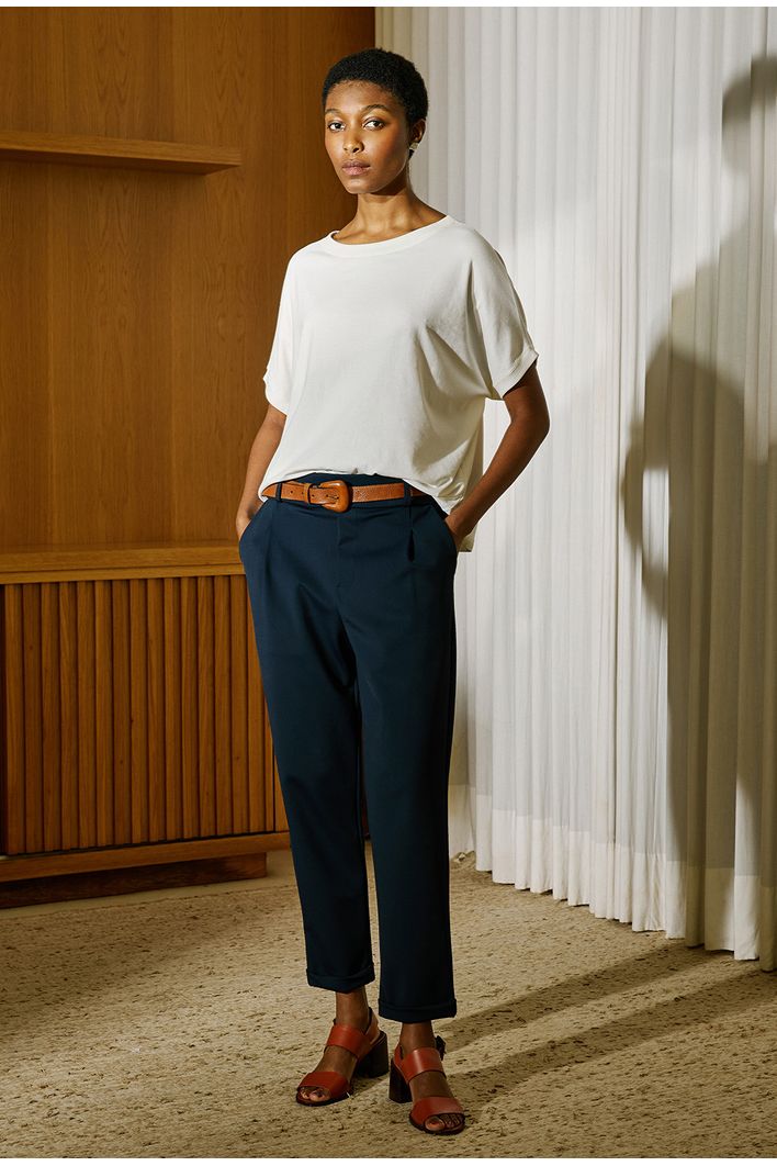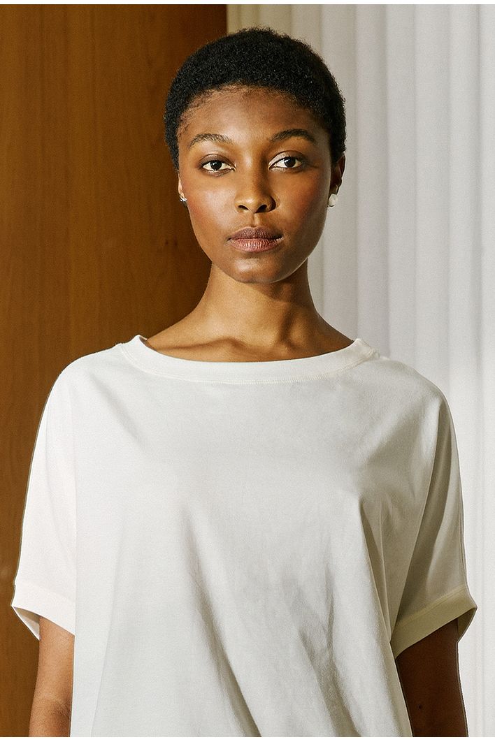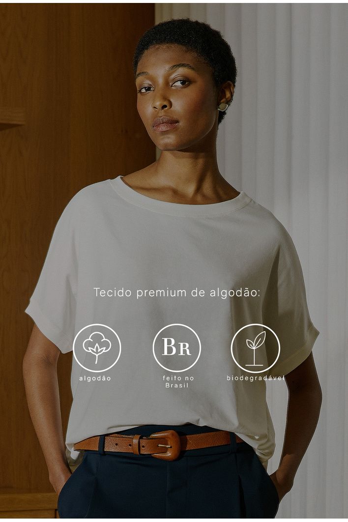 Nossa T-Shirt Meros é o basic versátil que vai facilitar muito o seu momento de se produzir. É confeccionada em malha de algodão com toque egípcio, sendo muito macia e fresquinha, devido à alta capacidade de absorção de umidade do algodão. Possui modelagem larguinha, gola canoa e mangas kimono, sendo uma peça versátil e atemporal, perfeita para quem ama unir elegância e conforto. Para quem deseja um visual despojado, uma boa escolha é combinar nossa Meros com peças para parte de baixo em denim e para os pés sapatos baixos e confortáveis. Já para quem deseja um visual sofisticado, que tal combinar com calça de alfaiataria e nosso paletó?