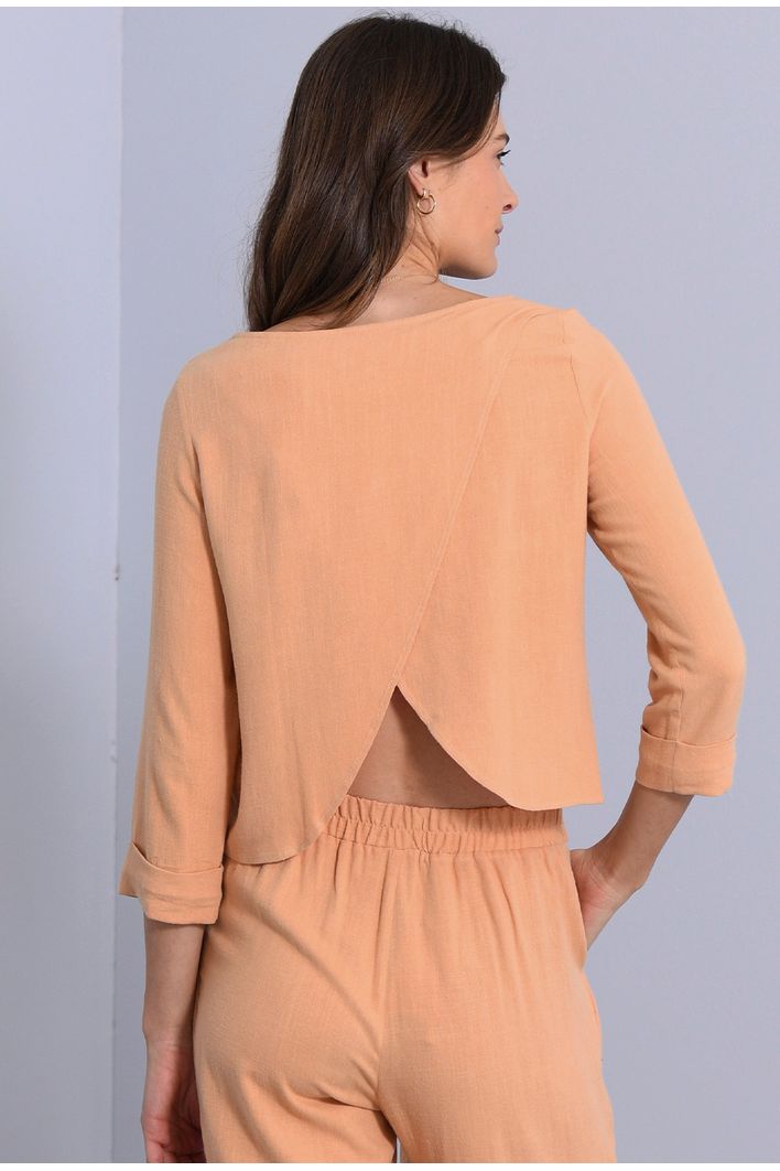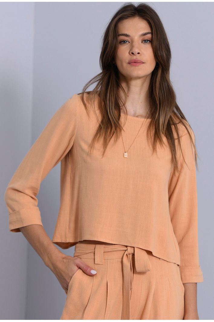 Nossa blusa olândia é um basic muito especial, possuindo abertura traseira, manga ¾ com dobradura muito charmosa nos punhos e decote redondo. É confeccionada em tecido com textura estonada, deixando este basic ainda mais especial. Por ser feita em tecido de viscose e linho é uma peça de toque leve e fresquinho.