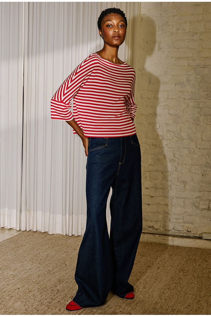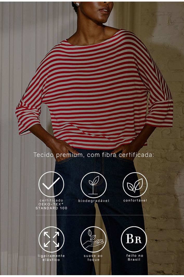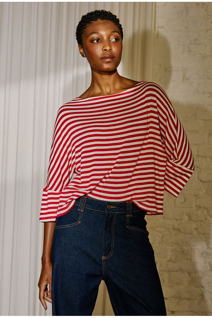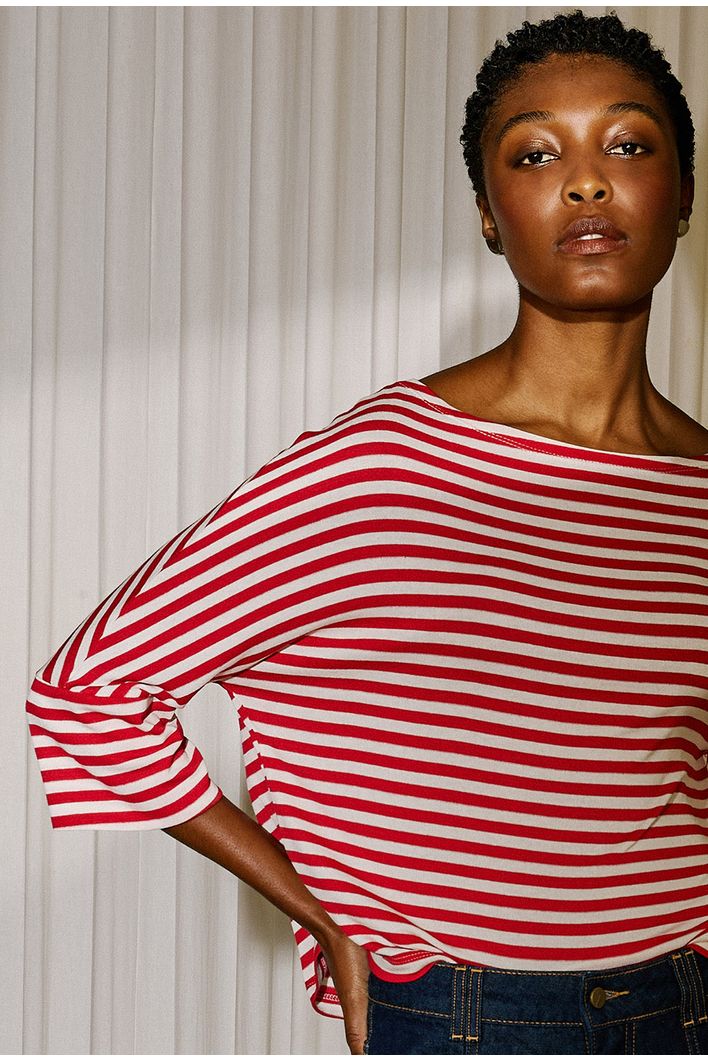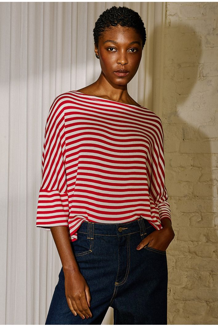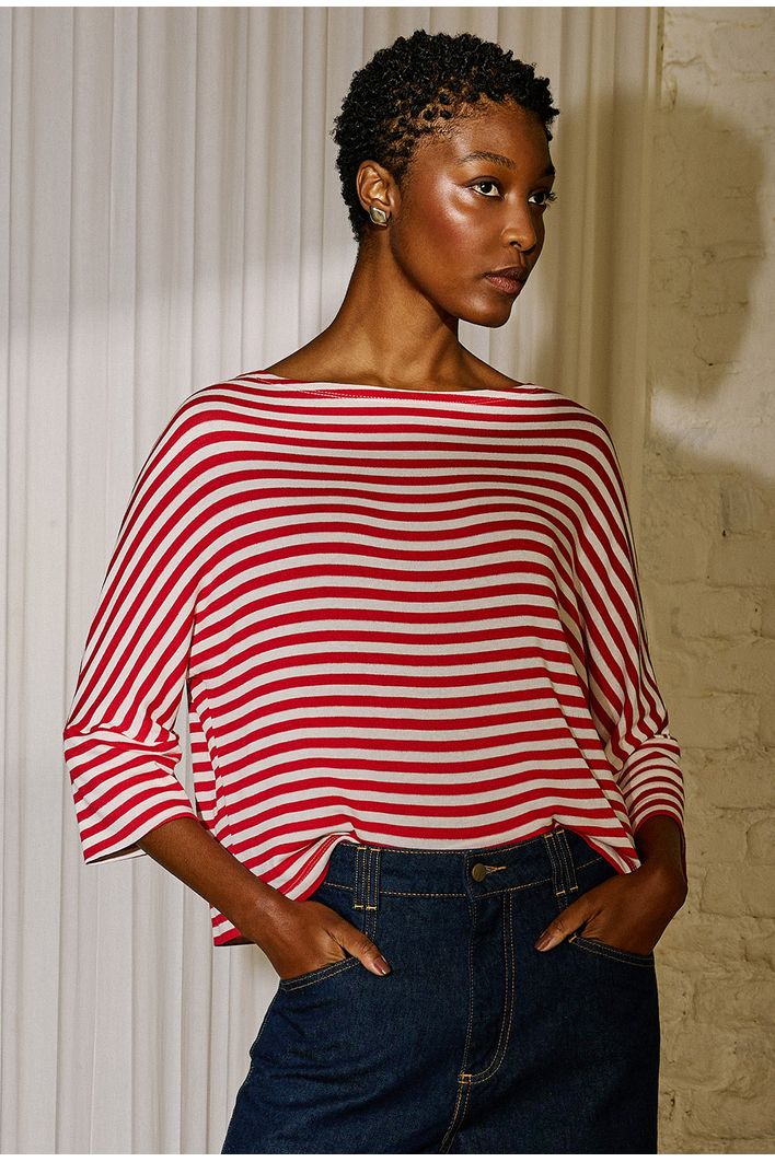 Blusa listrada com design atemporal e elegante, trazendo equilíbrio entre conforto e estilo. Seu decote canoa valoriza a região dos ombros, enquanto a modelagem ampla proporciona leveza ao vestir. As mangas 3/4 ganham destaque com acabamento levemente aberto, que adiciona movimento e sofisticação ao visual. Versátil e moderna, é a escolha perfeita para composições que vão do casual descontraído a produções mais refinadas.