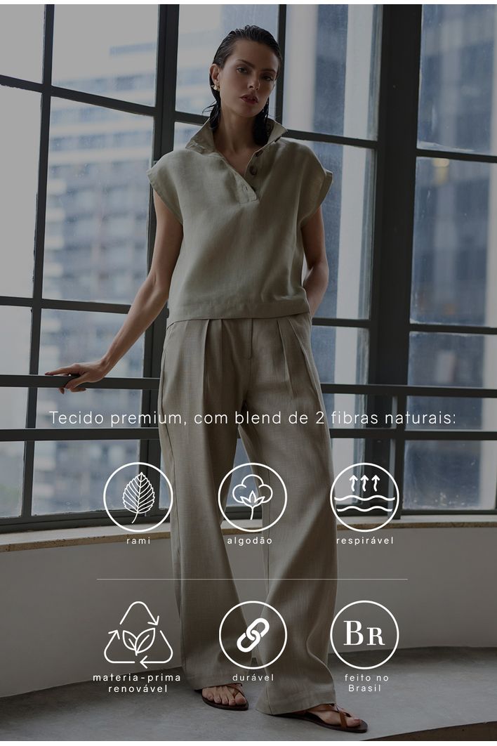 A calça Candros é confeccionada em algodão com rami, primo irmão do linho. O tecido rami tem vários benefícios, como ser durável, resistente, biodegradável e sustentável. A estética e benefícios são próximas do linho.