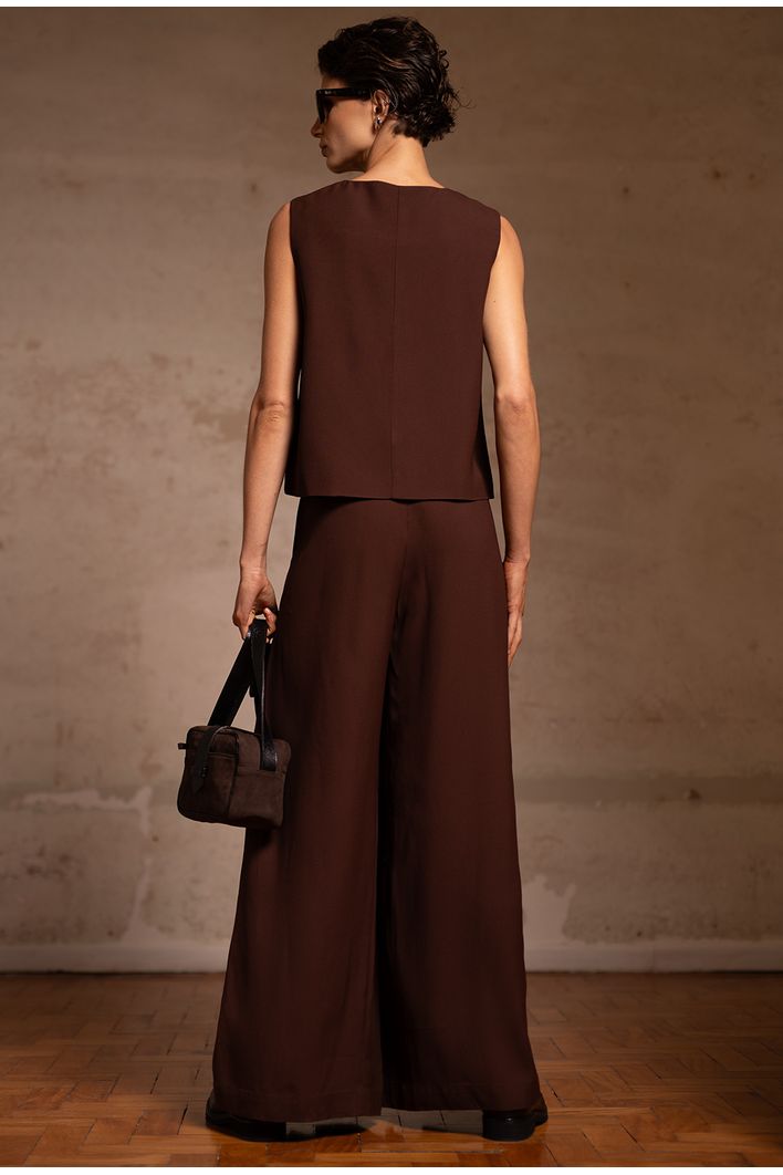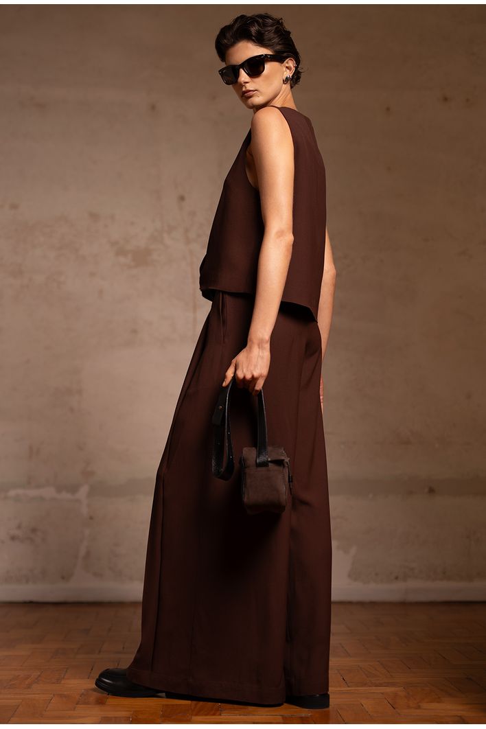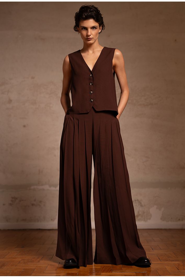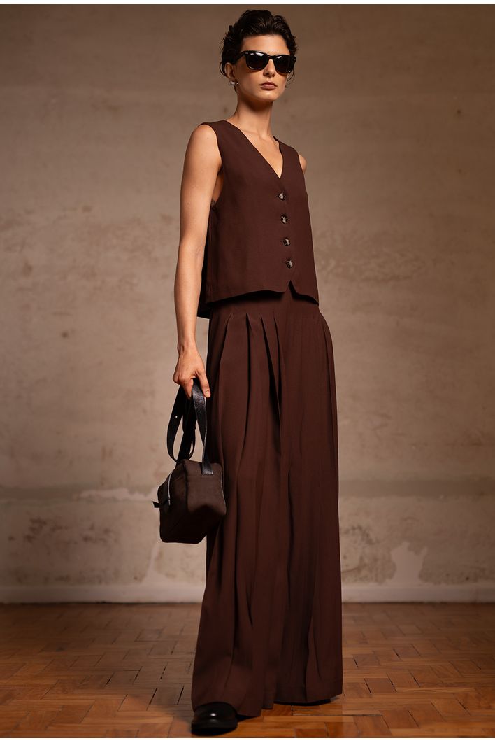 A Calça Chiloe é sinônimo de sofisticação e sustentabilidade. Confeccionada com o melhor crepe patou do mundo, sua qualidade se destaca pelo peso, visual refinado e certificações ambientais. O tecido apresenta um toque levemente creponado na parte externa, trazendo elegância, enquanto a face interna, em contato com a pele, oferece um toque acetinado ultra confortável. Utilizado em alfaiataria de alto padrão, a peça é feita com fibra de origem celulósica (proveniente de madeira certificada), natural e biodegradável. Com pregas frontais e caimento fluido, esta calça é perfeita para composições que exigem sofisticação e estilo.