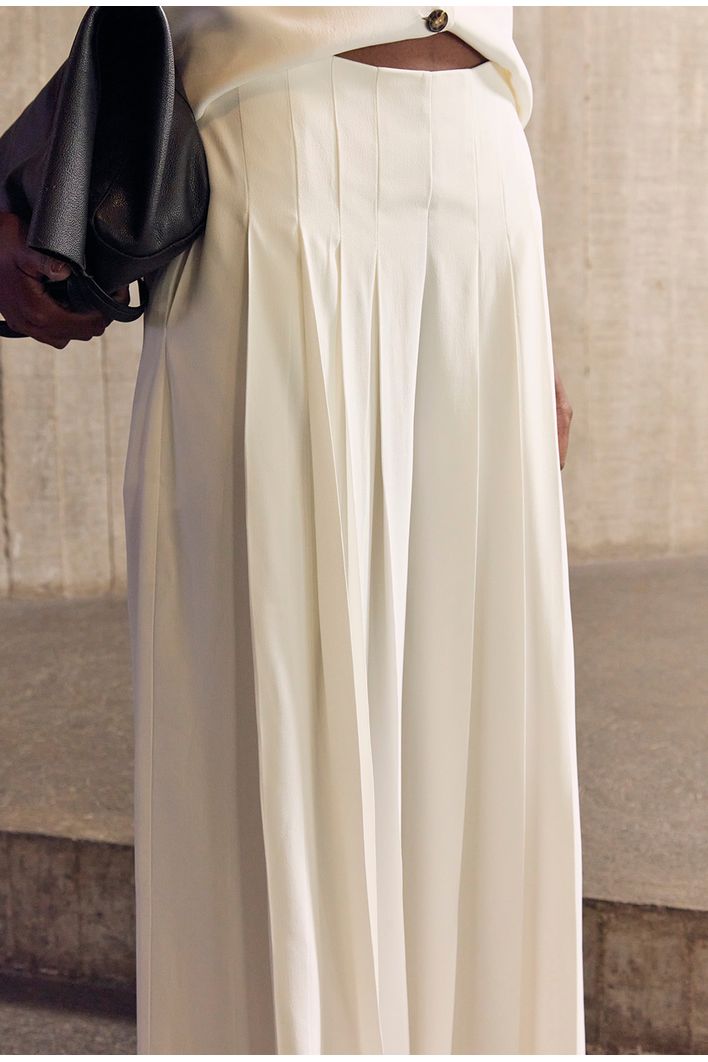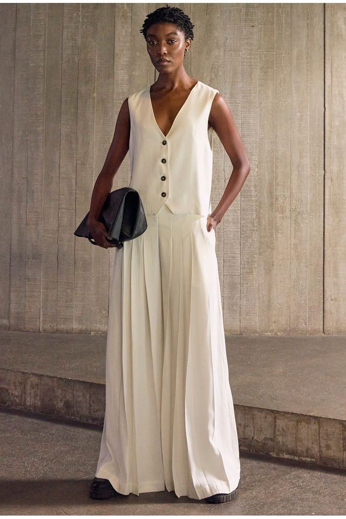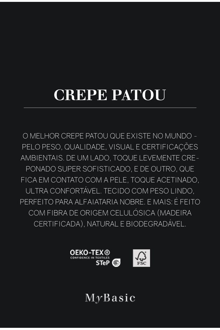 A Calça Chiloe é sinônimo de sofisticação e sustentabilidade. Confeccionada com o melhor crepe patou do mundo, sua qualidade se destaca pelo peso, visual refinado e certificações ambientais. O tecido apresenta um toque levemente creponado na parte externa, trazendo elegância, enquanto a face interna, em contato com a pele, oferece um toque acetinado ultra confortável. Utilizado em alfaiataria de alto padrão, a peça é feita com fibra de origem celulósica (proveniente de madeira certificada), natural e biodegradável. Com pregas frontais e caimento fluido, esta calça é perfeita para composições que exigem sofisticação e estilo.