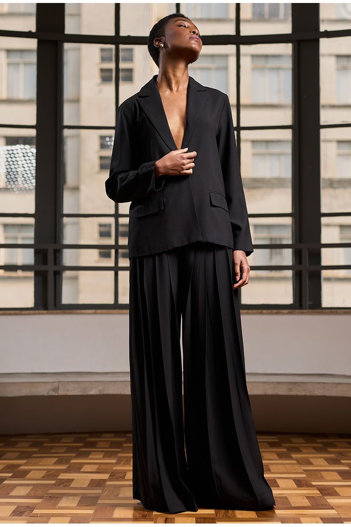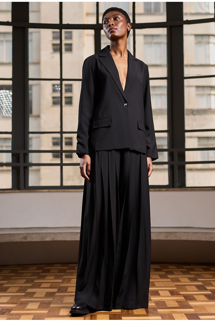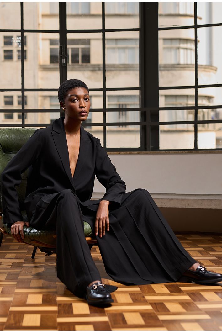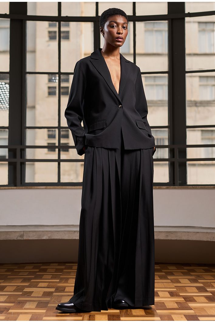 A Calça Chiloe é sinônimo de sofisticação e sustentabilidade. Confeccionada com o melhor crepe patou do mundo, sua qualidade se destaca pelo peso, visual refinado e certificações ambientais. O tecido apresenta um toque levemente creponado na parte externa, trazendo elegância, enquanto a face interna, em contato com a pele, oferece um toque acetinado ultra confortável. Utilizado em alfaiataria de alto padrão, a peça é feita com fibra de origem celulósica (proveniente de madeira certificada), natural e biodegradável. Com pregas frontais e caimento fluido, esta calça é perfeita para composições que exigem sofisticação e estilo.