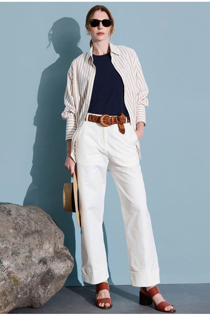 Com comprimento um pouco acima do calcanhar, é perfeita para compor looks modernos e versáteis. A barra mais grossa adiciona um toque de estilo, tornando a peça ainda mais charmosa. Possui botão central e bolsos frontais, que garantem praticidade e um visual equilibrado entre o casual e o elegante.