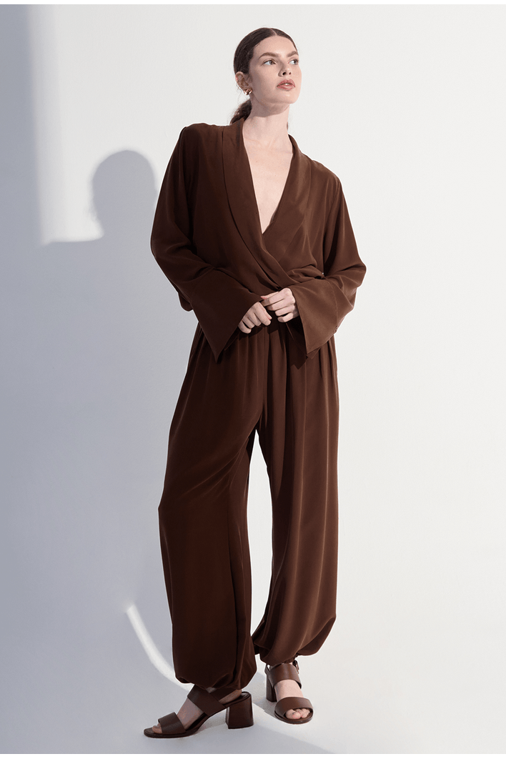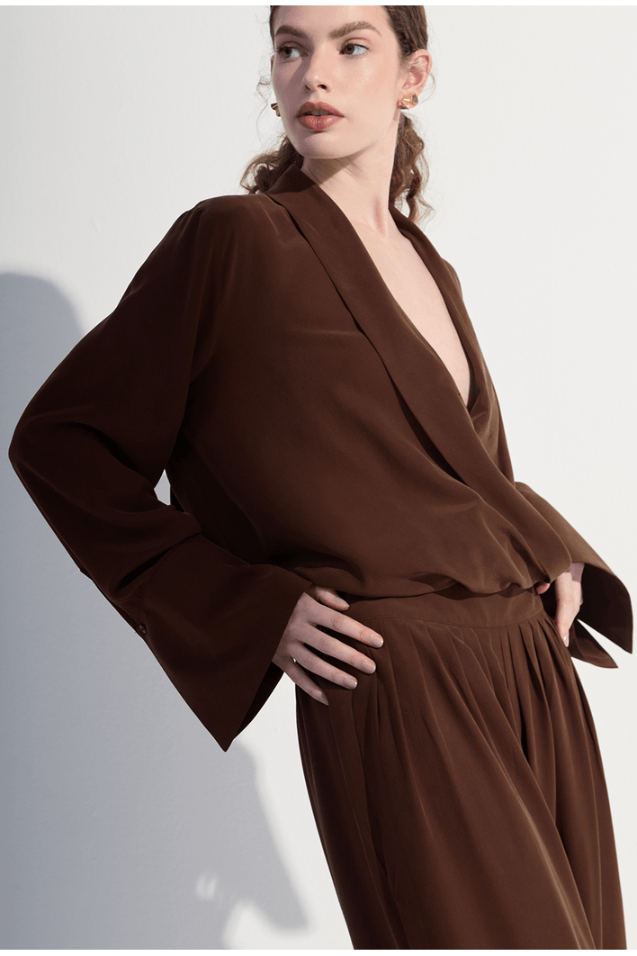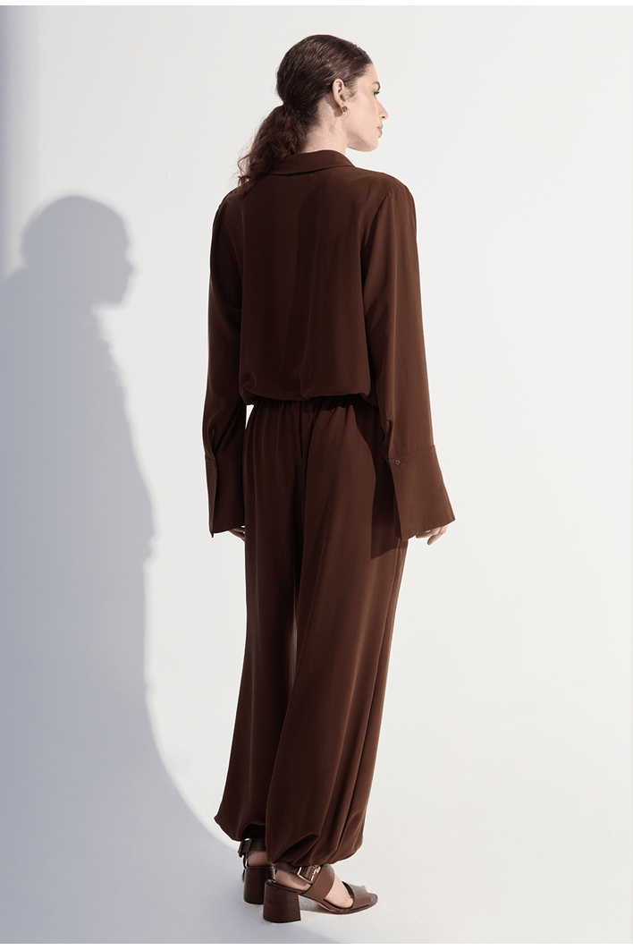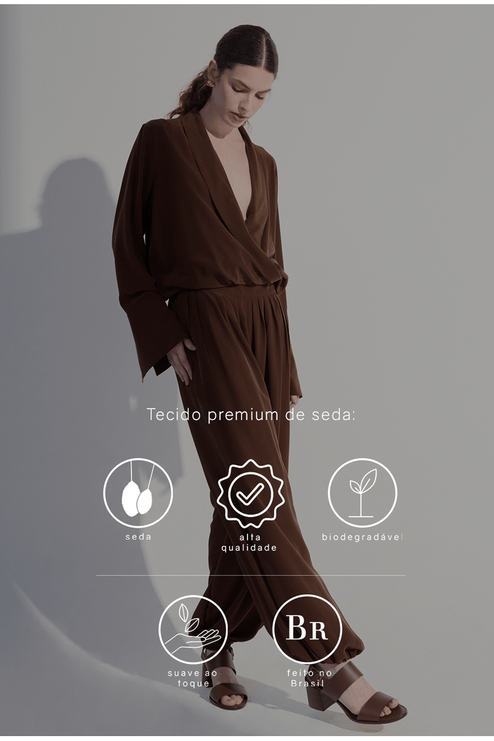 Confeccionada em seda pura, esta calça traz leveza, fluidez e sofisticação em cada detalhe. Seu caimento solto cria um movimento elegante e natural, enquanto o toque suave da seda proporciona uma experiência de conforto absoluto. O cós estruturado valoriza a cintura sem perder a sensação de liberdade, e o volume das pernas adiciona modernidade e personalidade ao visual.