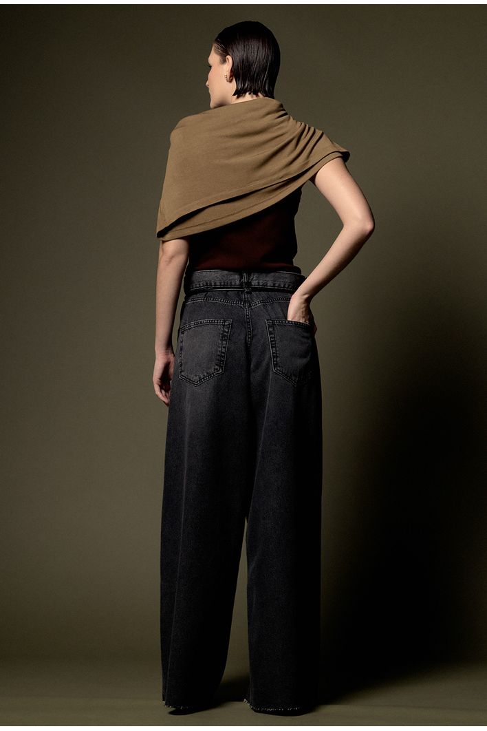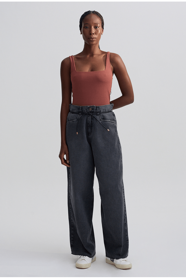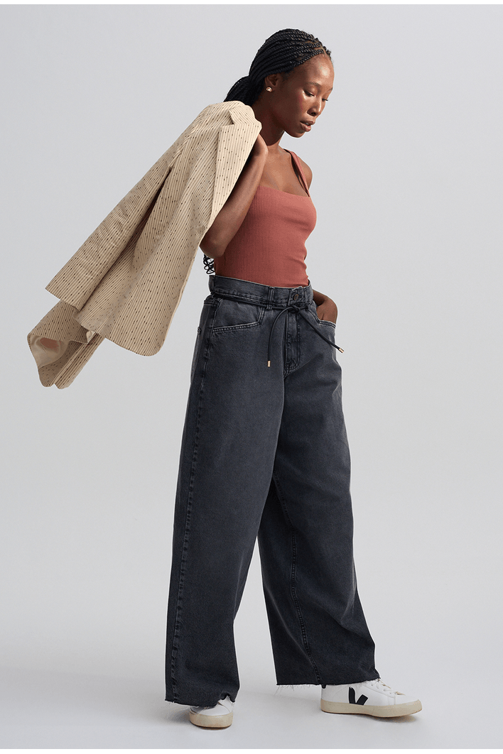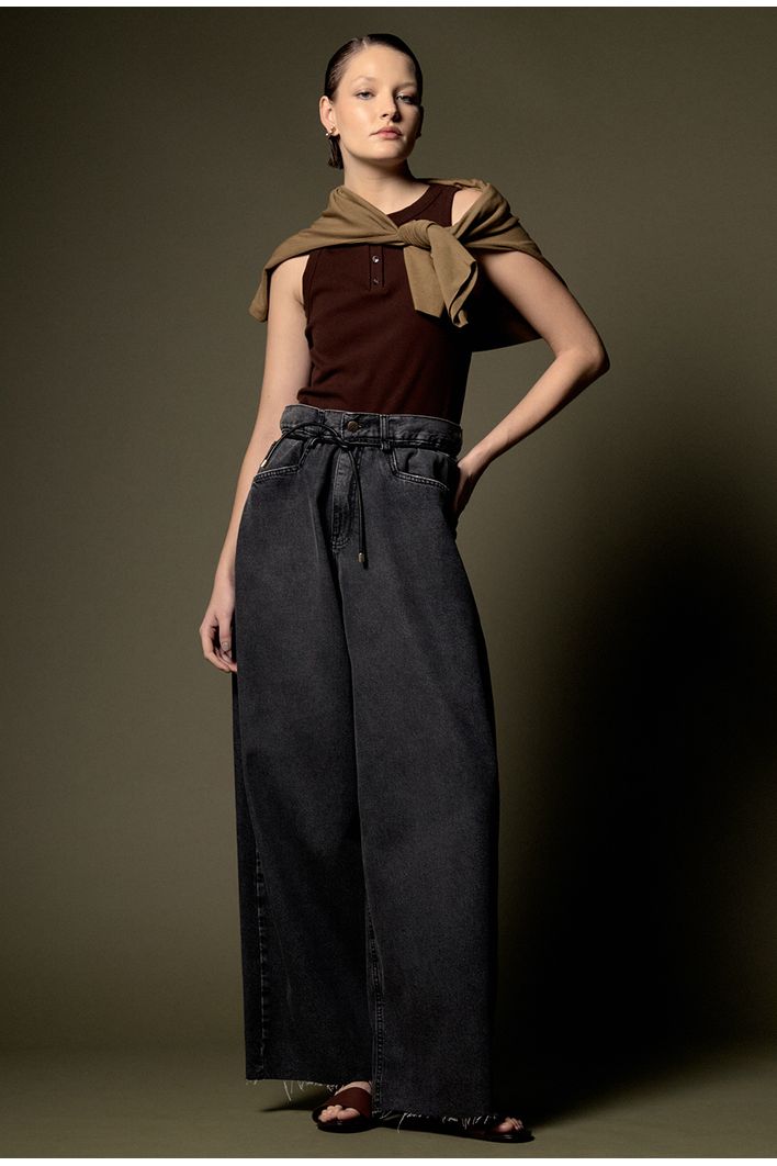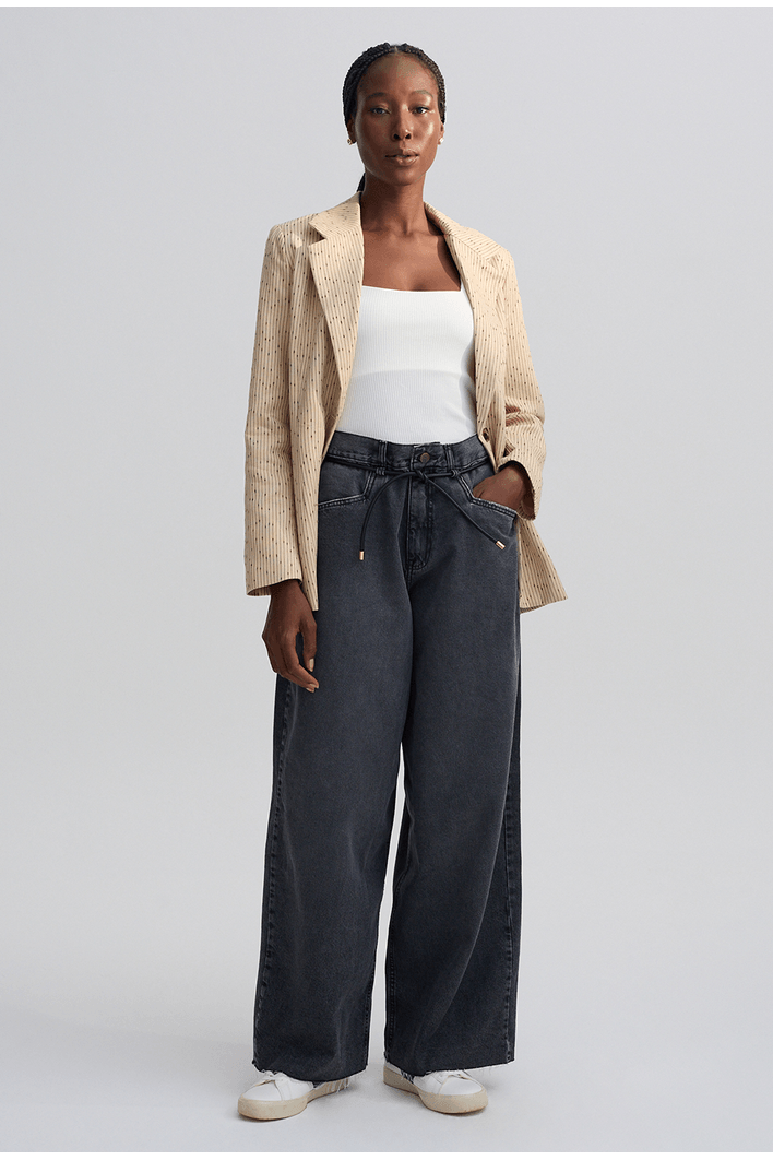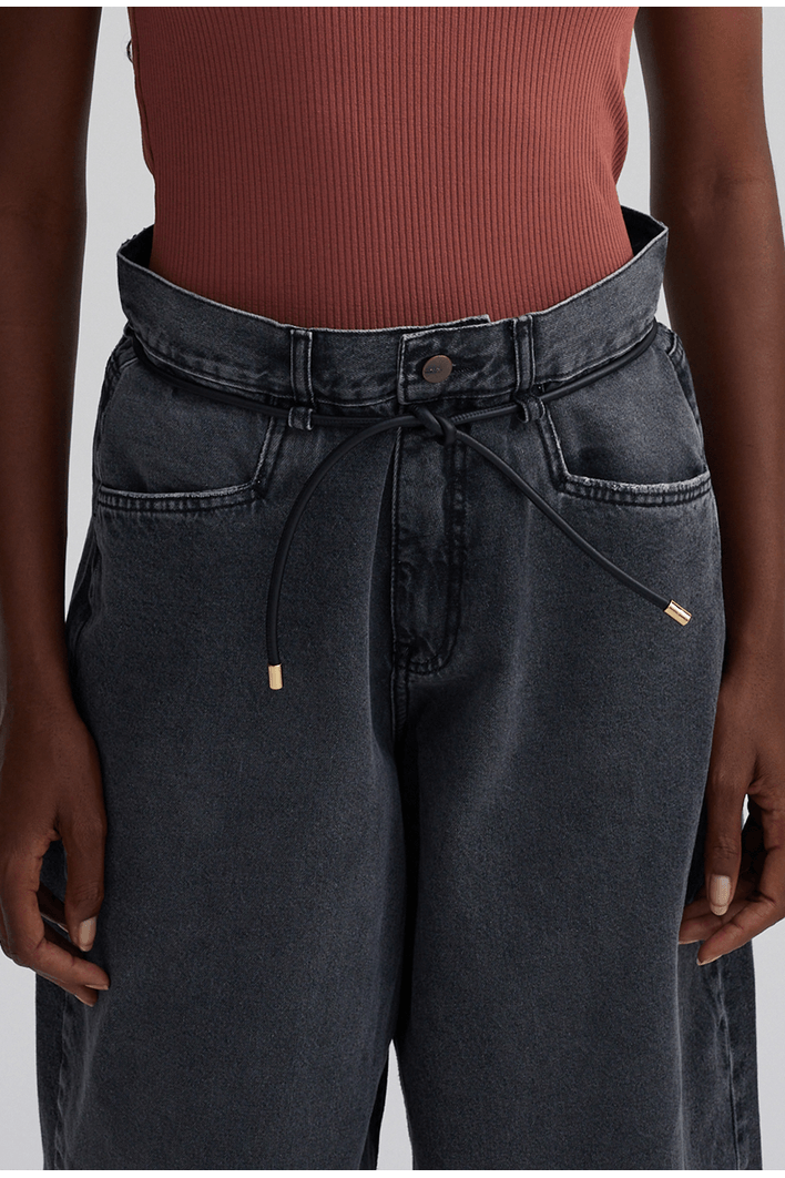 Calça de modelagem ampla e caimento fluido, que une conforto e elegância em uma proposta contemporânea. Possui cintura alta com amarração ajustável em cordão de couro, que adiciona um toque sofisticado e moderno ao visual. Os bolsos frontais amplos complementam o design versátil, ideal para composições urbanas e refinadas.