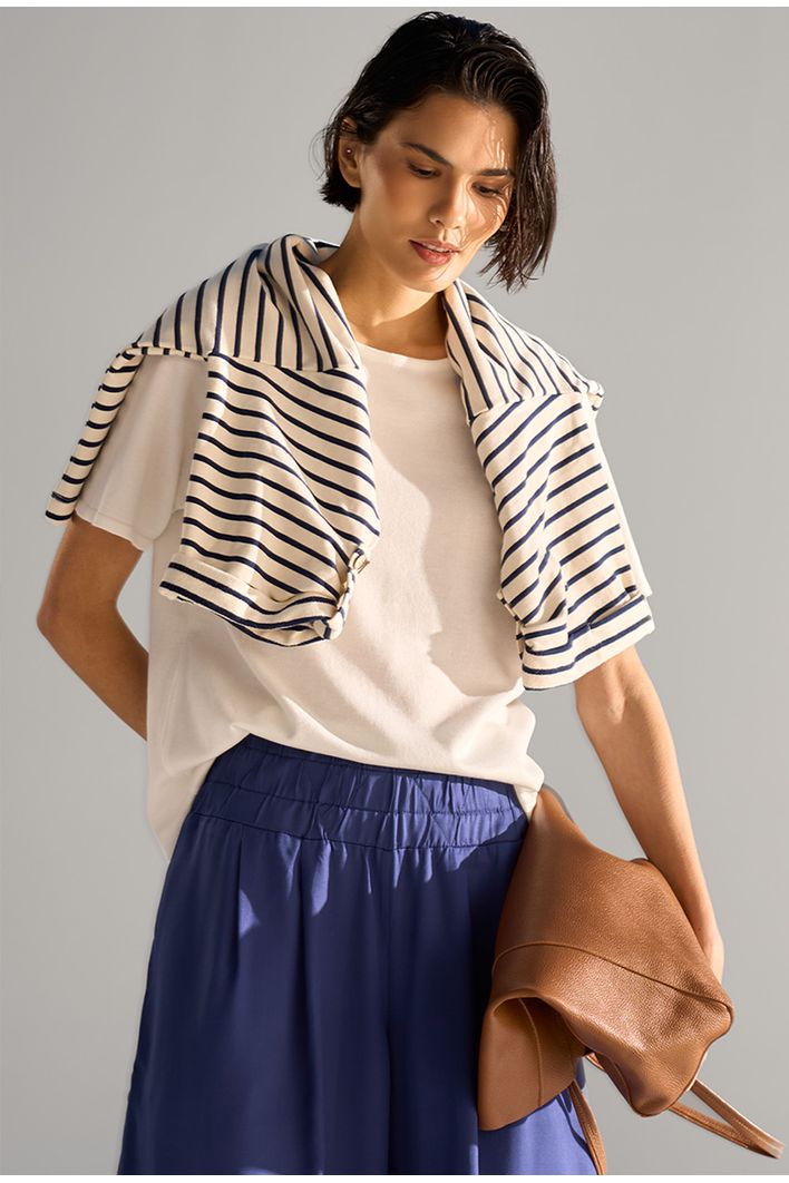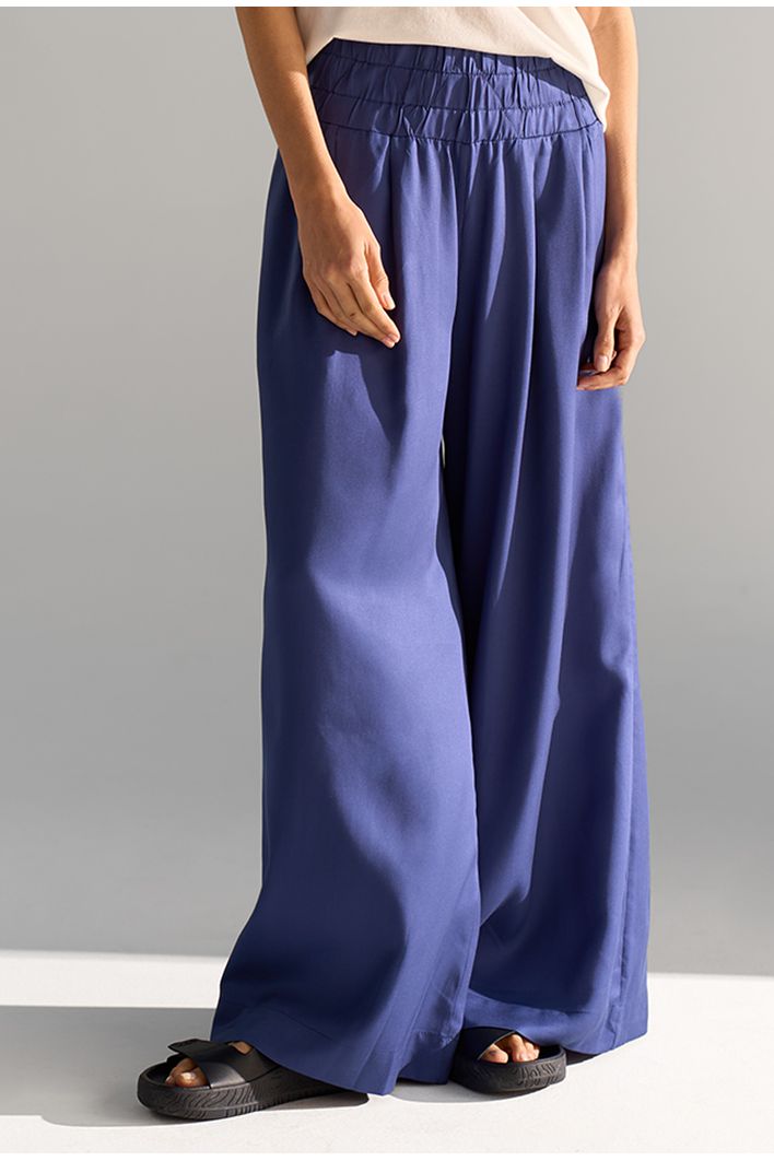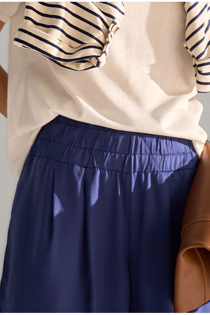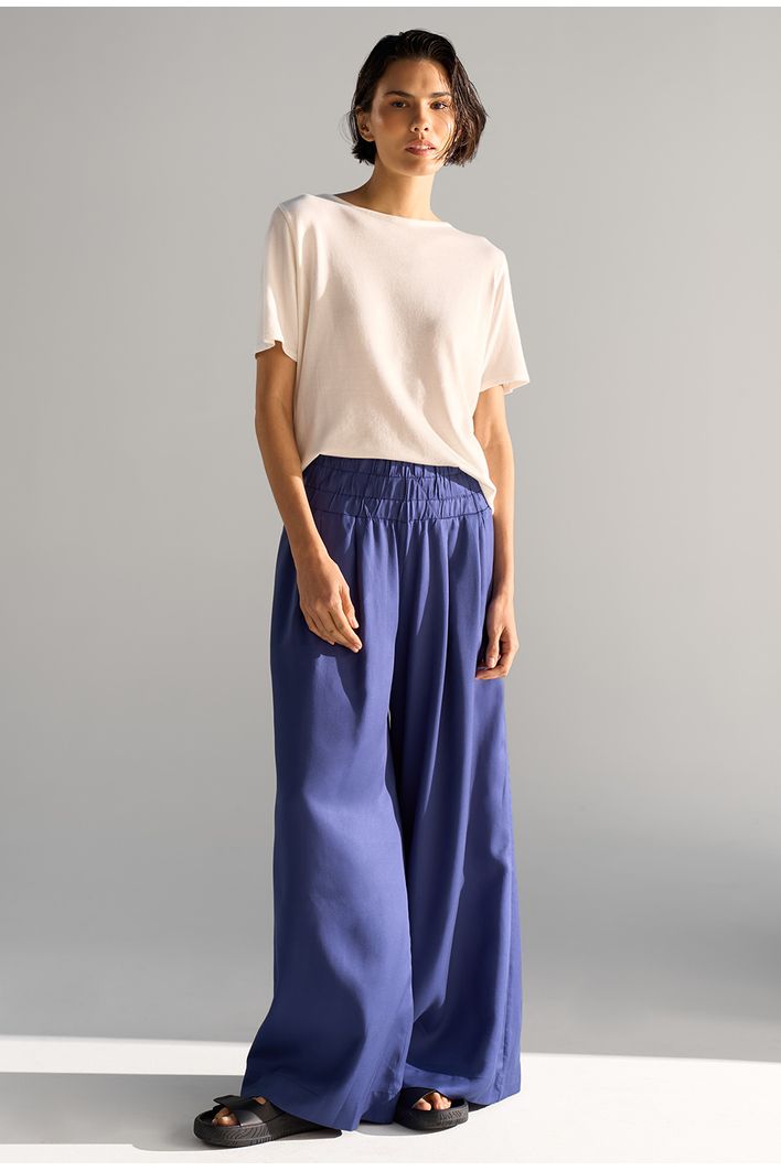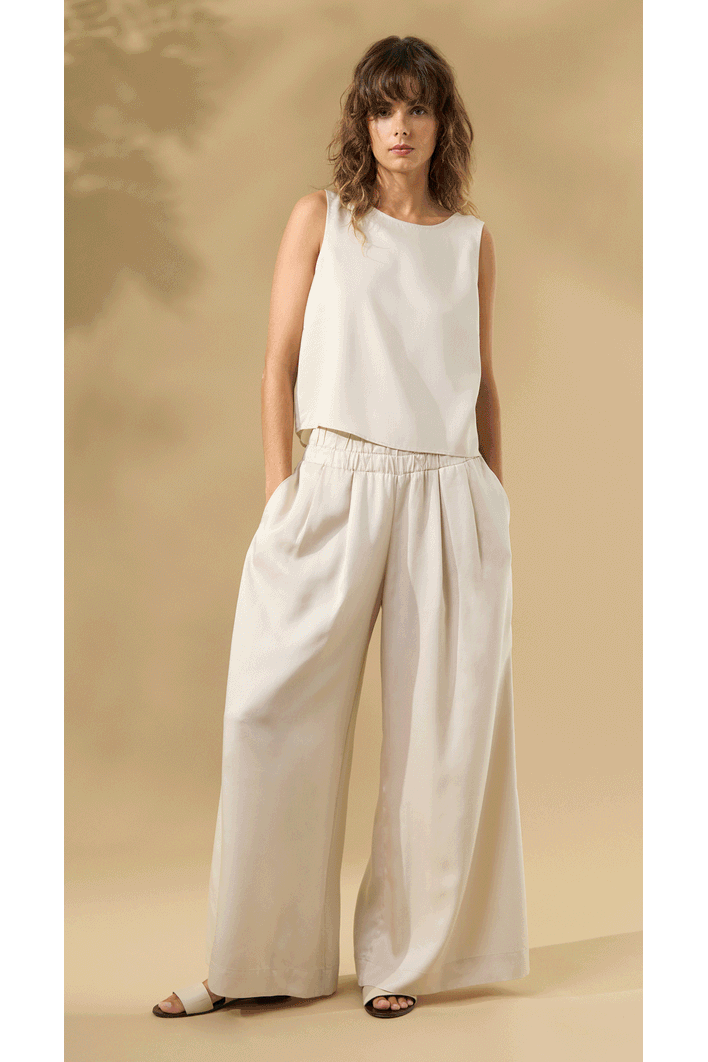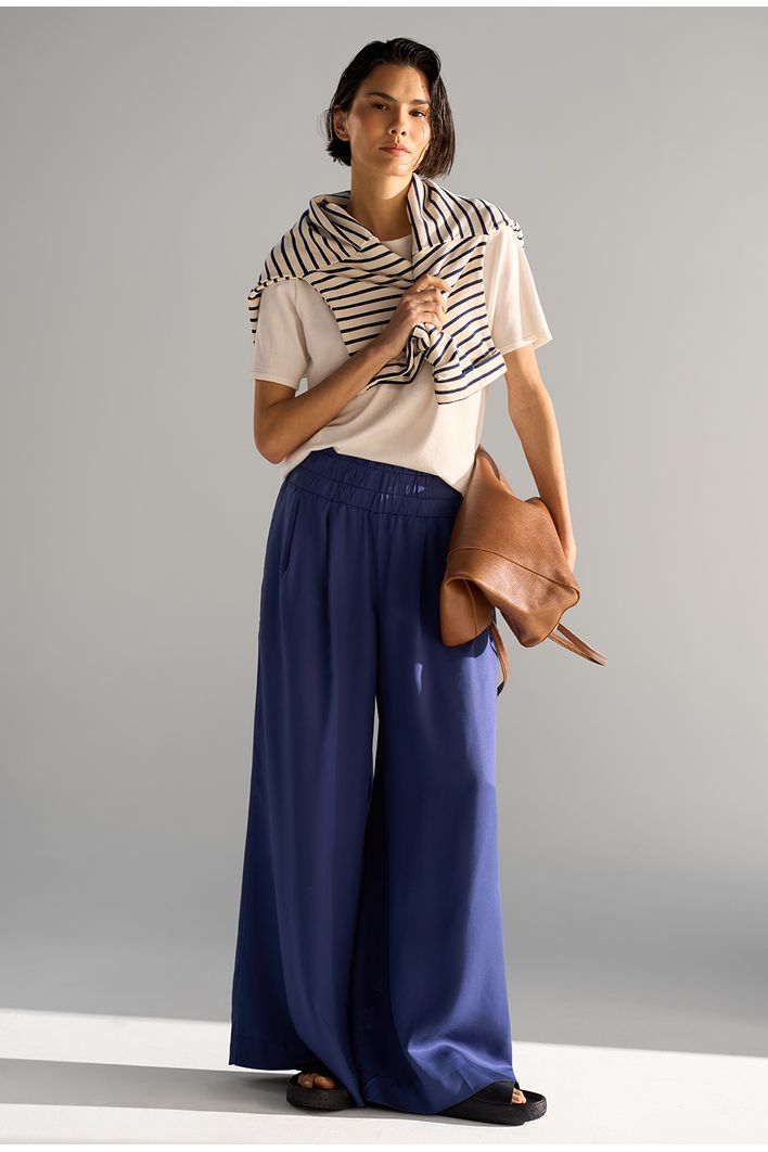 A nossa queridinha calça Kalyves é uma peça de modelagem larguinha, cós largo de elástico e bolsos invisíveis. É confortável e muito versátil, possibilitando várias combinações. Fica linda quando combinada com partes de cima de comprimento mais curto, criando uma composição ousada, elegante e divertida, perfeita para uma noite de verão. Mais uma ideia para dias quentes é usá-la com nossas regatinhas básicas. Já nos dias frios, é perfeita para usar com uma blusinha básica de manga longa e blazer como sobreposição. O legal deste look é que, apesar de ser mais sofisticado e elegante, pode facilmente ganhar um ar mais despojado quando combinado com acessórios casuais, como um boné, por exemplo. A dica é abusar do styling, apostando em acessórios, bolsas e sapatos no mood que desejar.