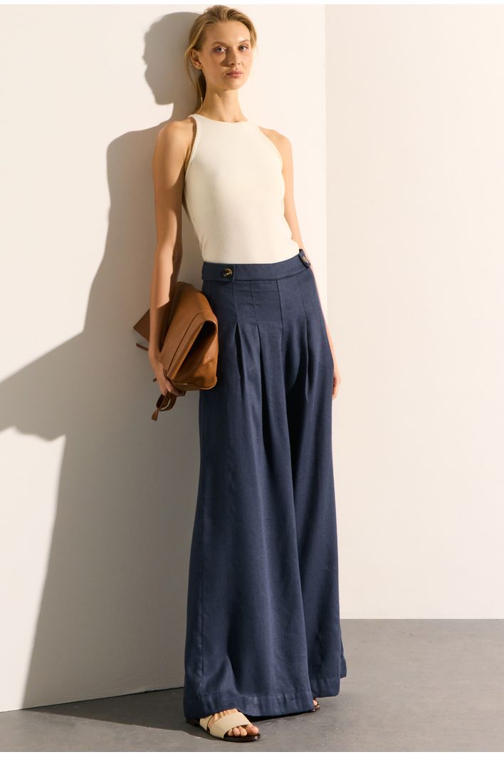 Peça elegante e moderna, confeccionada em tecido premium de viscose e linho. Com modelagem pantalona, a calça oferece fluidez e sofisticação, além de contar com bolsos frontais e traseiros para maior funcionalidade. O grande diferencial está no cós exclusivo, que possui botões decorativos em cada lateral, tanto na parte frontal quanto traseira, criando um design único e cheio de personalidade.