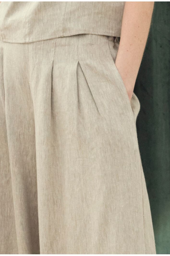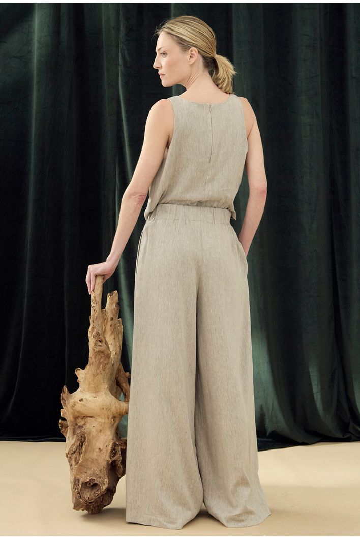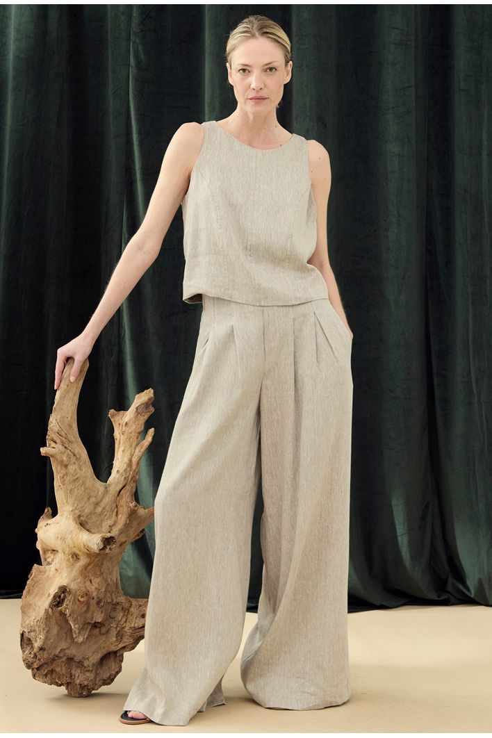 Com modelagem de decote nadador, a regata traz um design elegante e contemporâneo, valorizado por recortes delicados ao longo do comprimento. Desenvolvida em uma mistura refinada de linho orgânico e viscose certificada FSC, a peça garante um toque macio, frescor e excelente caimento. Além disso, sua matéria-prima é de fonte renovável e biodegradável, unindo estilo e consciência ambiental. Perfeita para composições versáteis, do casual ao sofisticado.