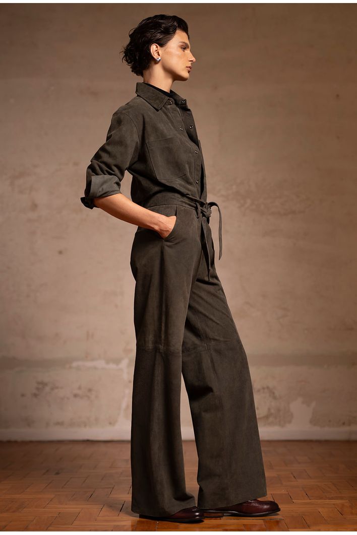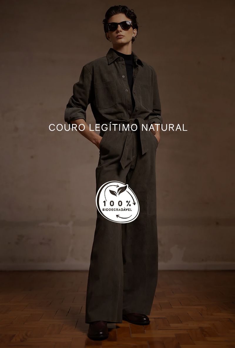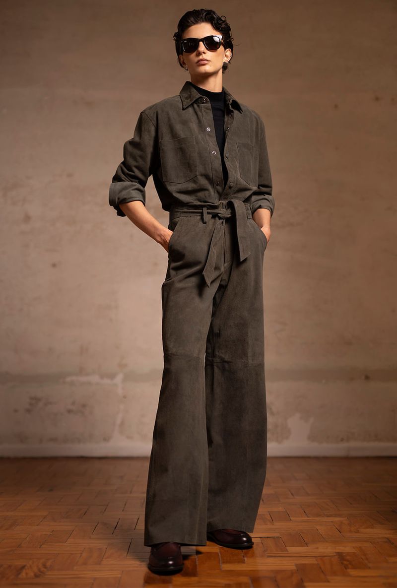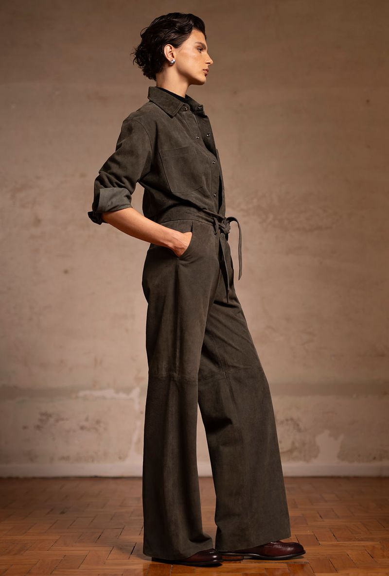 Confeccionada em couro chamois, seu toque aveludado e macio proporciona conforto sem abrir mão da sofisticação. A modelagem pantalona valoriza a silhueta com fluidez e movimento, enquanto o caimento impecável reforça a proposta de um visual moderno e atemporal.