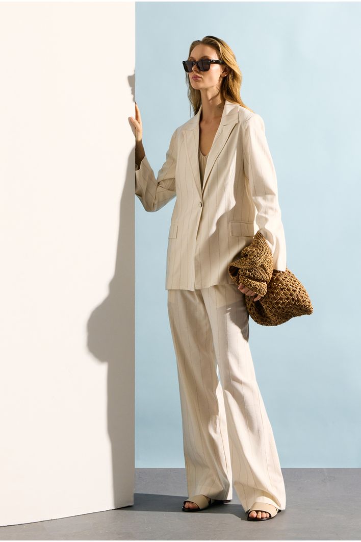 Calça Canáreos é uma peça com listras verticais que imitam pespontos, adicionando um toque diferenciado e delicado ao visual – nada de uma listra comum, mas um padrão sutil e sofisticado. Com modelagem reta, essa calça é sinônimo de elegância e versatilidade, ideal para quem busca uma peça que combine estilo com conforto.