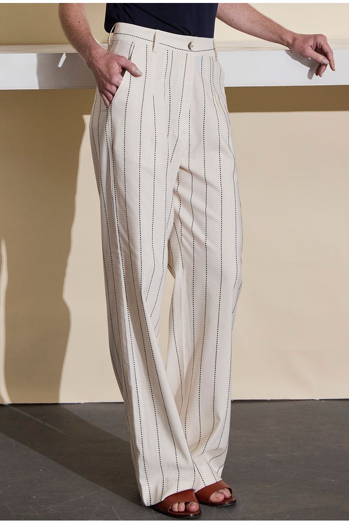 Calça Canáreos é uma peça com listras verticais que imitam pespontos, adicionando um toque diferenciado e delicado ao visual – nada de uma listra comum, mas um padrão sutil e sofisticado. Com modelagem reta, essa calça é sinônimo de elegância e versatilidade, ideal para quem busca uma peça que combine estilo com conforto.