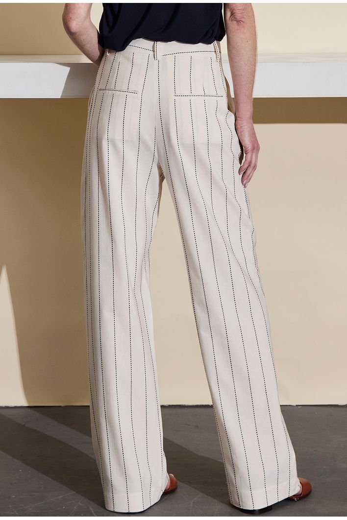 As linhas verticais têm efeito visual, alongando a silhueta, trazendo elegância em sua composição. Além disso, a calça conta com dois bolsos frontais e dois bolsos traseiros, somados a passantes que permitem o uso de cintos ou faixas, para um ajuste personalizado e um toque de estilo extra.