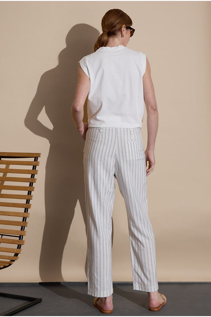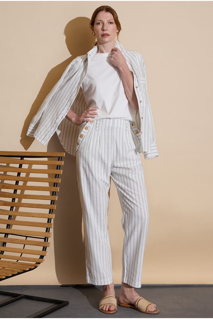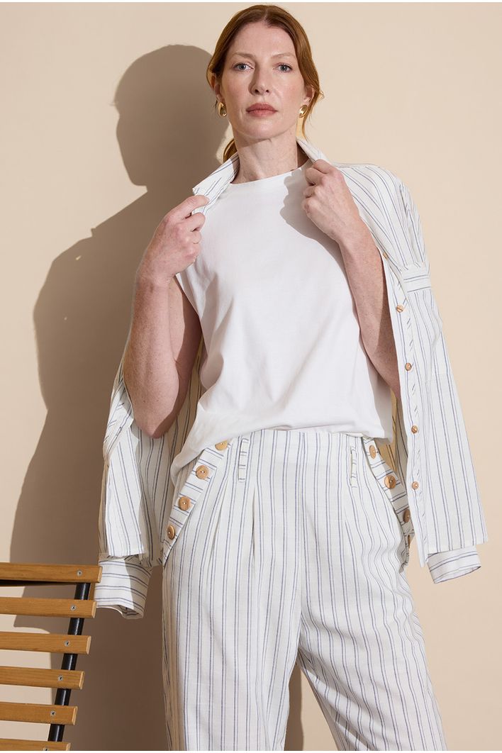 A Calça Cerro combina estilo, conforto e funcionalidade em uma peça versátil e elegante. Com modelagem reta, oferece um caimento clássico que alonga a silhueta. Sua estampa de listras verticais adiciona um toque moderno e contribui para um visual mais alongado e sofisticado.