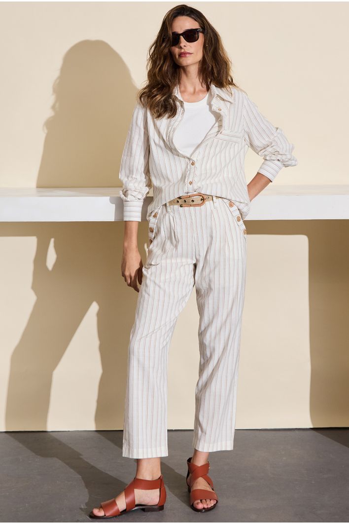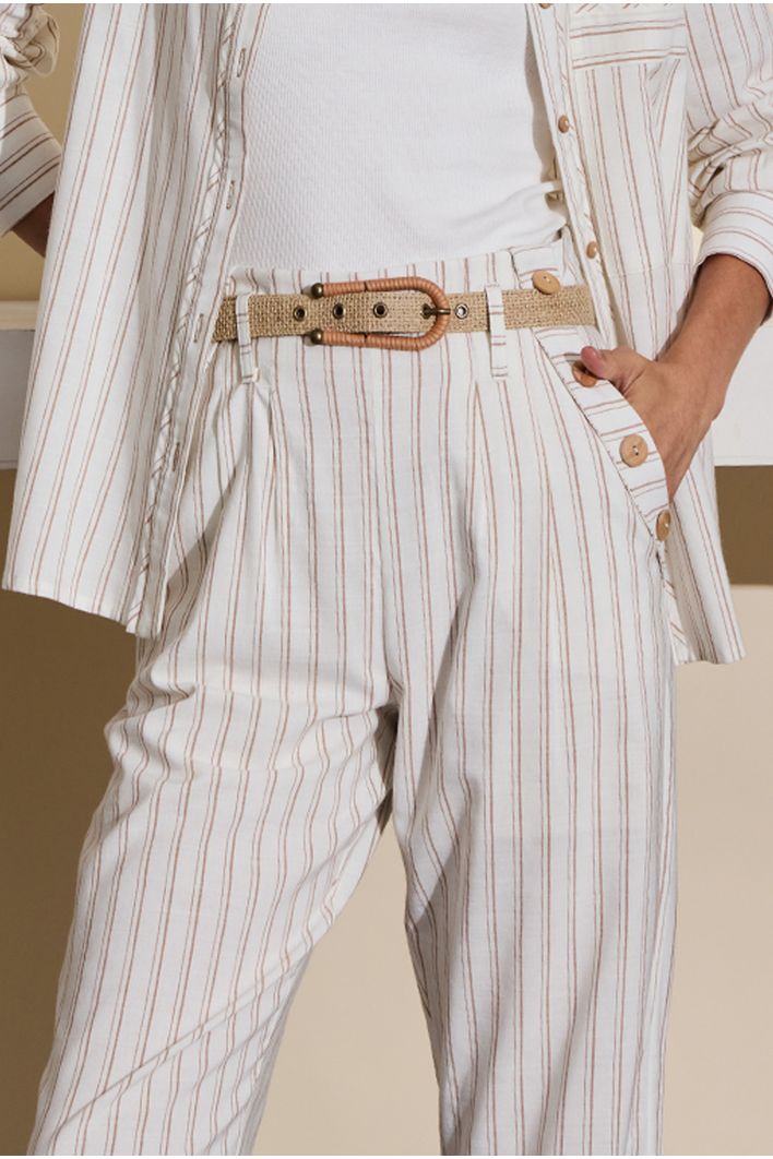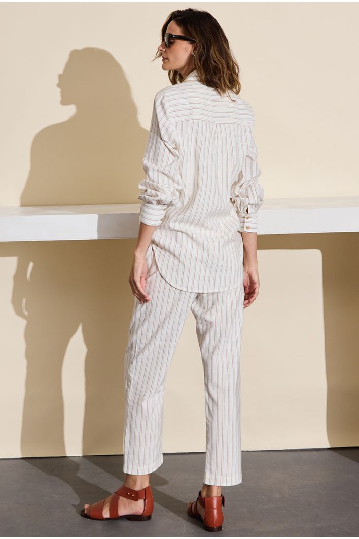 A Calça Cerro combina estilo, conforto e funcionalidade em uma peça versátil e elegante. Com modelagem reta, oferece um caimento clássico que alonga a silhueta. Sua estampa de listras verticais adiciona um toque moderno e contribui para um visual mais alongado e sofisticado.