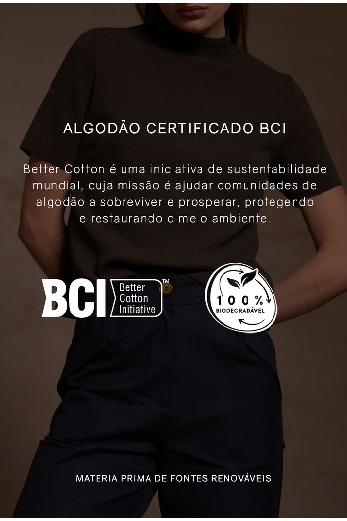A certificação BCI (Better Cotton Initiative) é um selo que garante que o algodão usado no produto foi produzido de forma mais sustentável promovendo o uso eficiente da água, a redução de produtos químicos perigosos e o respeito aos direitos dos trabalhadores.