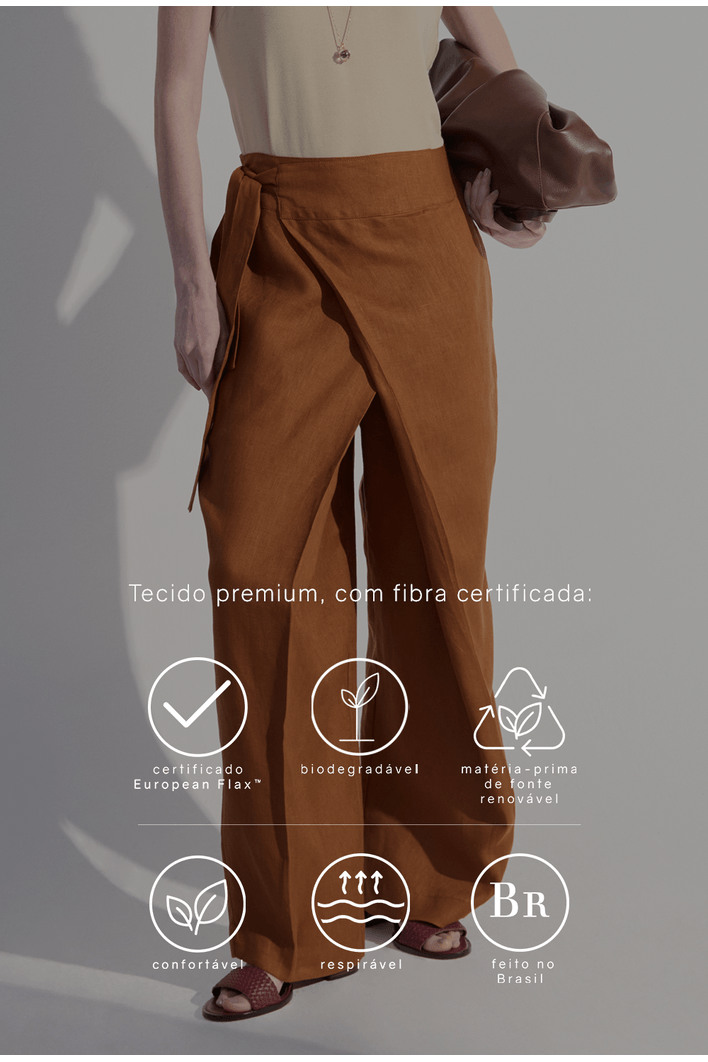 Com design diferenciado e toque sofisticado, a calça-saia traz o equilíbrio perfeito entre fluidez e estrutura. a sobreposição frontal cria um efeito leve e moderno, que remete ao movimento de uma saia, mantendo o conforto e a praticidade de uma calça. Confeccionada em linho, oferece frescor e textura natural, ideal para compor produções elegantes e versáteis. Pode ser usada com camisas soltas para um visual casual refinado ou com tops ajustados para um toque contemporâneo.
