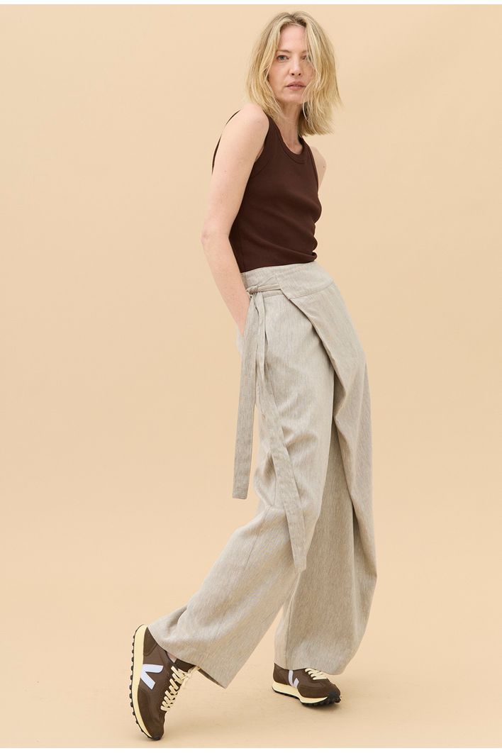 Sua modelagem sofisticada e autêntica destaca-se pelo transpasse com amarração, um detalhe elegante que valoriza a cintura e permite ajuste perfeito ao corpo. Os bolsos laterais adicionam funcionalidade e praticidade ao design minimalista e versátil.