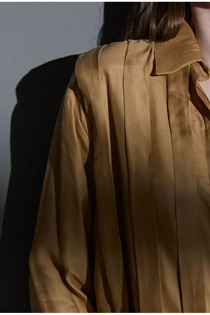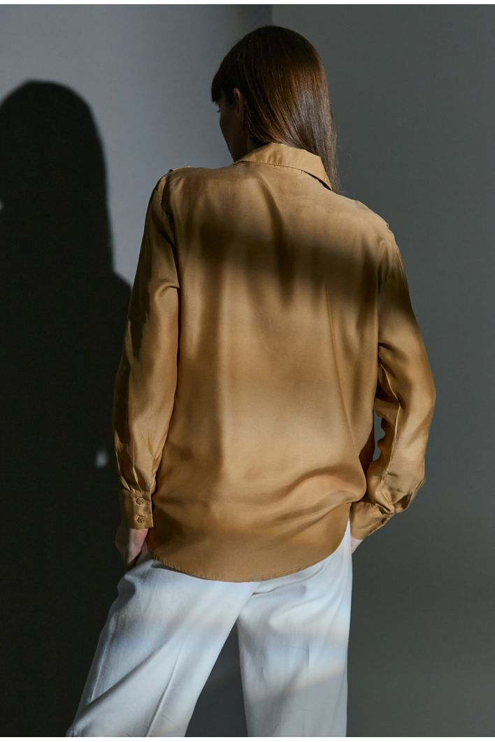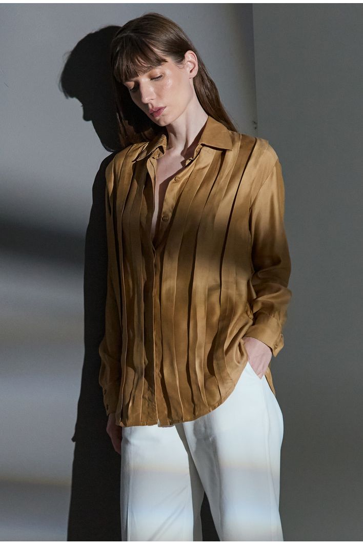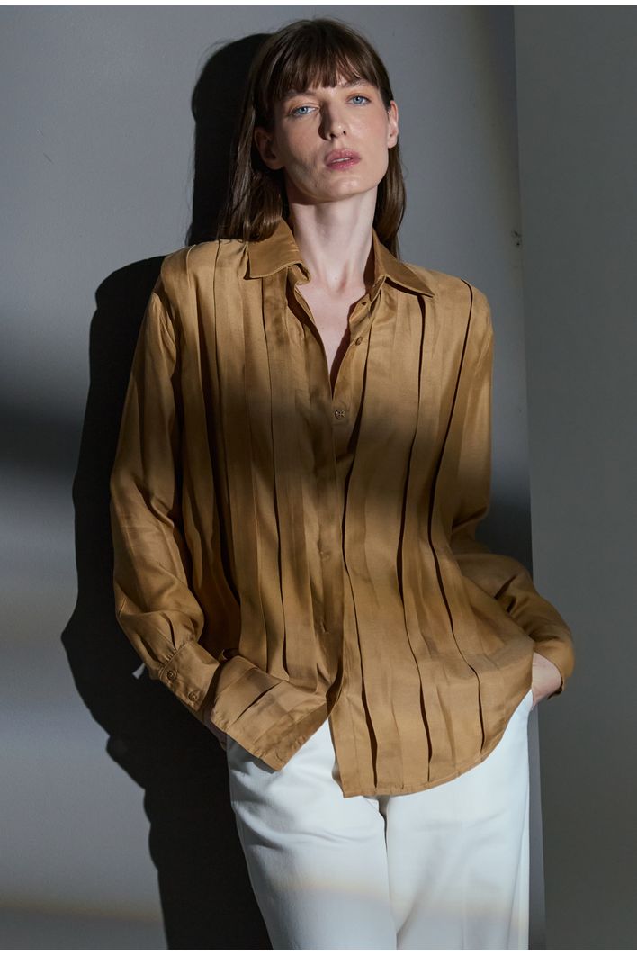 Feita em tecido super especial, não só pela qualidade das fibras e suas certificações, mas pela aparência sofisticada e toque acetinado. Os detalhes e pregas largas a tornaram uma camisa nada óbvia e super chic. Use com jeans, com calça de alfaiataria, com saia ou calça de couro. Vai bem com tudo, versátil do jeito que uma boa roupa básica deve ser.