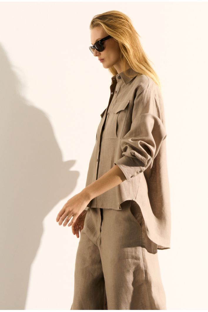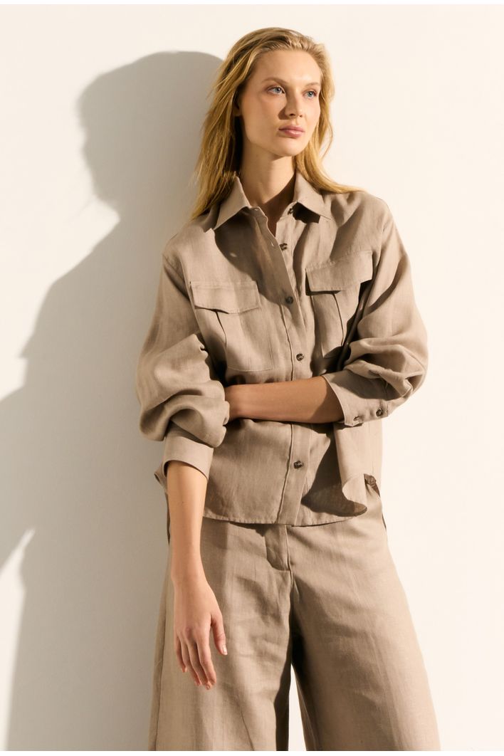 A camisa apresenta dois bolsos frontais, que adicionam praticidade e um charme utilitário à peça. Seu design moderno inclui um comprimento assimétrico entre frente e costas, que confere movimento e um toque contemporâneo ao visual. Os botões em todo o comprimento completam a peça, permitindo ajustes e facilitando a composição de diferentes estilos.