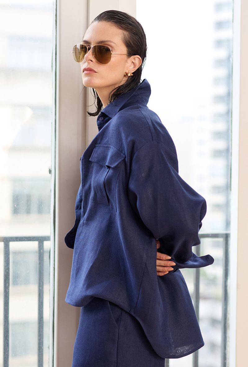 A camisa apresenta dois bolsos frontais, que adicionam praticidade e um charme utilitário à peça. Seu design moderno inclui um comprimento assimétrico entre frente e costas, que confere movimento e um toque contemporâneo ao visual. Os botões em todo o comprimento completam a peça, permitindo ajustes e facilitando a composição de diferentes estilos.