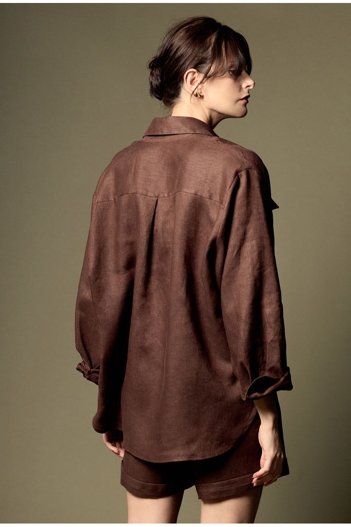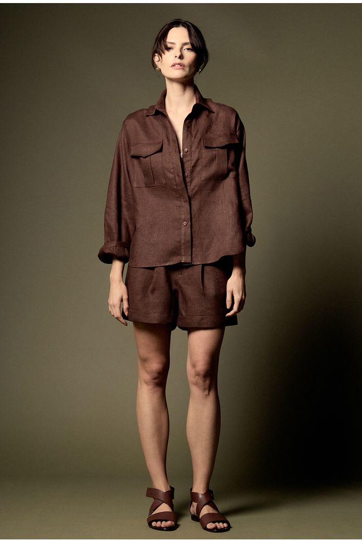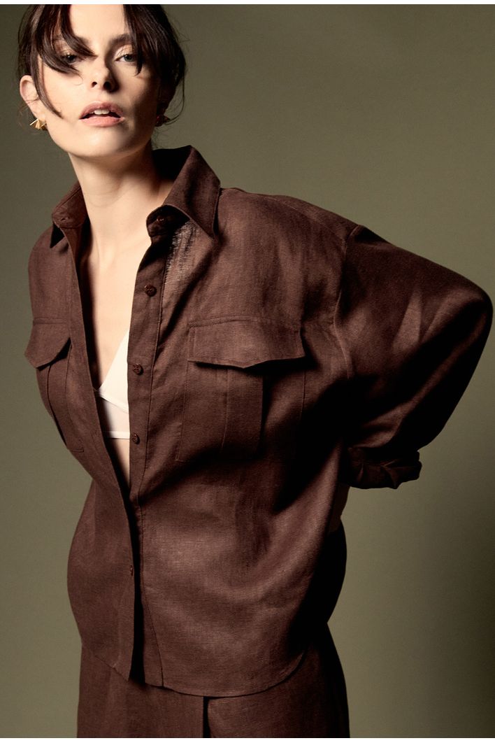 A camisa apresenta dois bolsos frontais, que adicionam praticidade e um charme utilitário à peça. Seu design moderno inclui um comprimento assimétrico entre frente e costas, que confere movimento e um toque contemporâneo ao visual. Os botões em todo o comprimento completam a peça, permitindo ajustes e facilitando a composição de diferentes estilos.