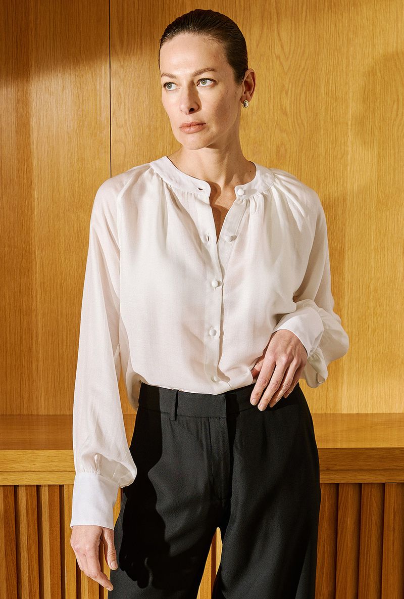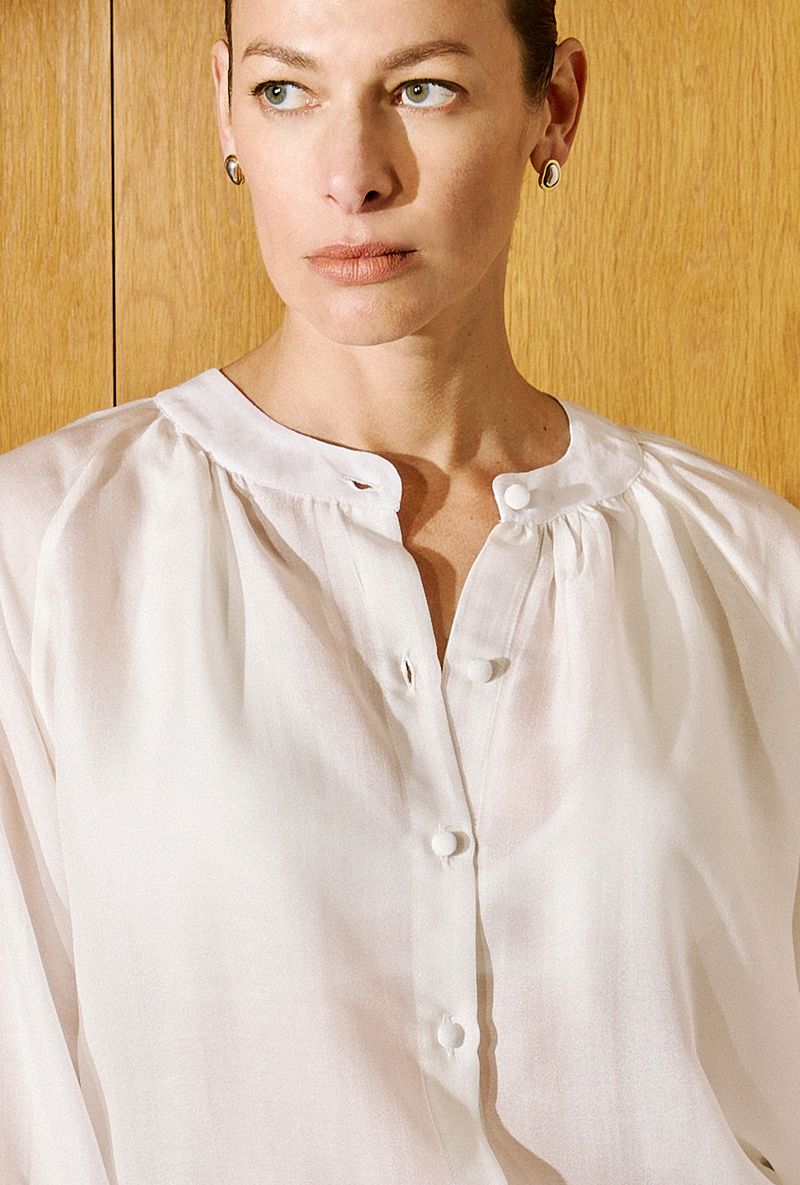 Camisa sofisticada confeccionada em tecido leve e respirável, que combina caimento fluido com um toque natural. O design apresenta gola redonda, fechamento frontal por botões forrados e mangas longas com punhos marcantes, que adicionam elegância e estilo atemporal. Versátil e refinada, é a peça ideal para compor produções modernas que transitam facilmente do casual ao sofisticado.