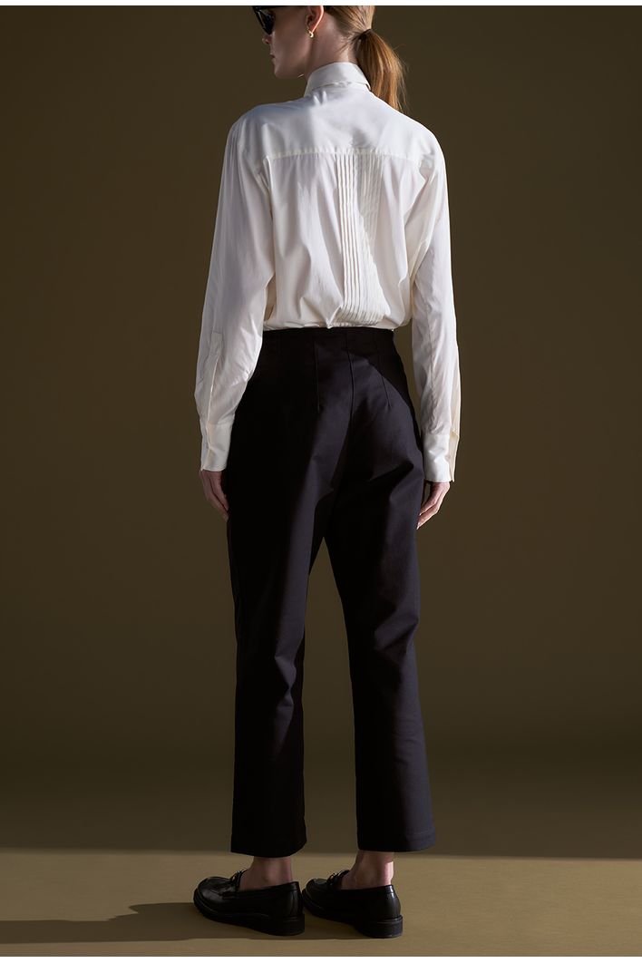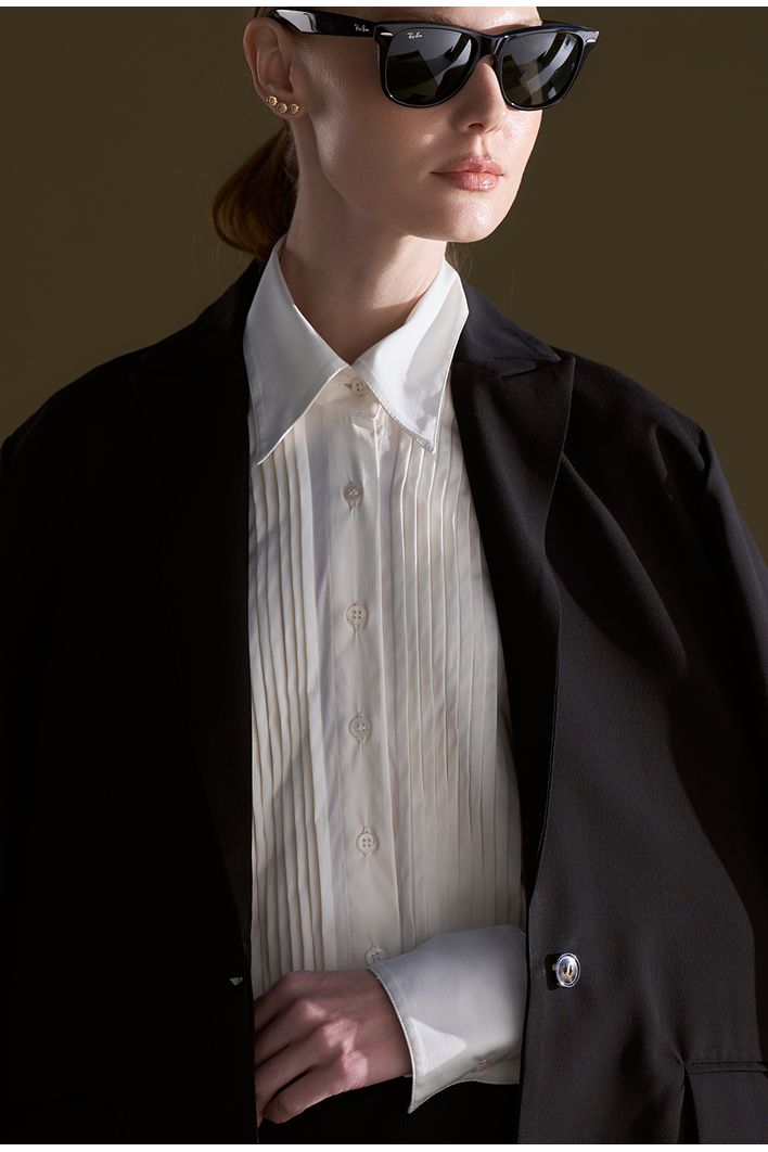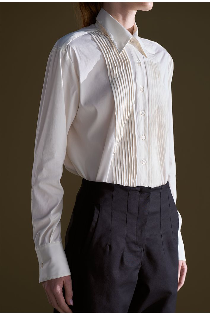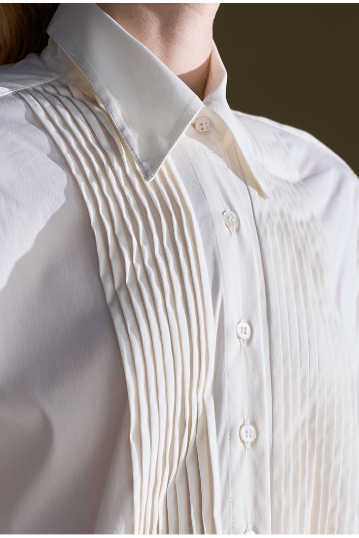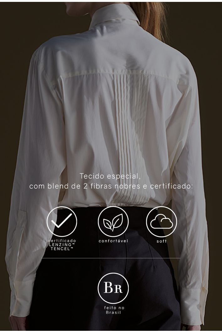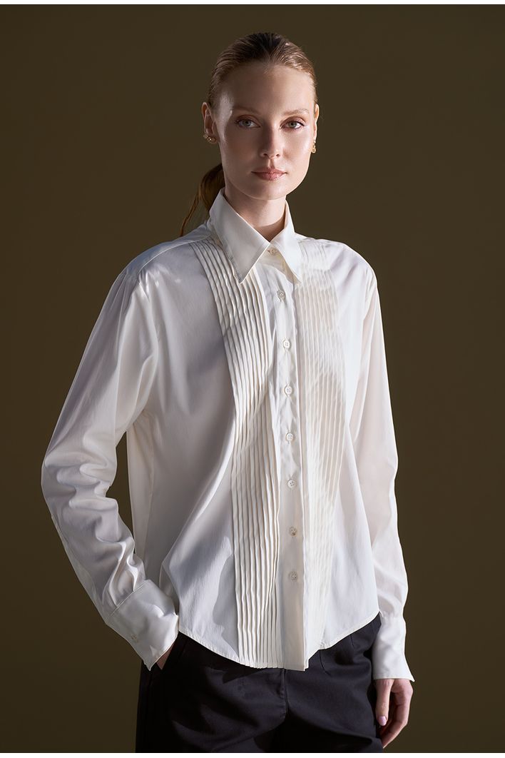 Camisa de manga longa com design sofisticado, confeccionada em tecido leve e de toque suave. Possui gola clássica, fechamento frontal por botões e delicado detalhe de pregas verticais na parte frontal, que conferem textura e elegância à peça. Os punhos apresentam abotoamento simples, reforçando o acabamento refinado. Versátil, pode compor tanto looks formais quanto produções casuais elegantes.